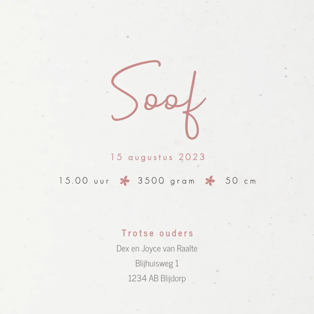 Dit geboortekaartje is een ontwerp van Jollein® uit de Bloom collectie en is speciaal in samenwerking met Jollein® ontworpen. Alle designelementen staan daarom vast waardoor het ontwerp zelf niet aanpasbaar is. Je kunt de teksten uiteraard wel gemakkelijk aanpassen in de editor.