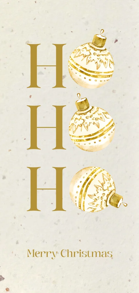 Duurzame kerstkaart met in goudkleurig de tekst 'Ho Ho Ho Merry Christmas'. Extra leuk aan deze kerstkaart is dat de letter 'o' van de tekst is vervangen voor gouden kerstballen. Pas de teksten en kleuren naar eigen smaak aan in de editor.