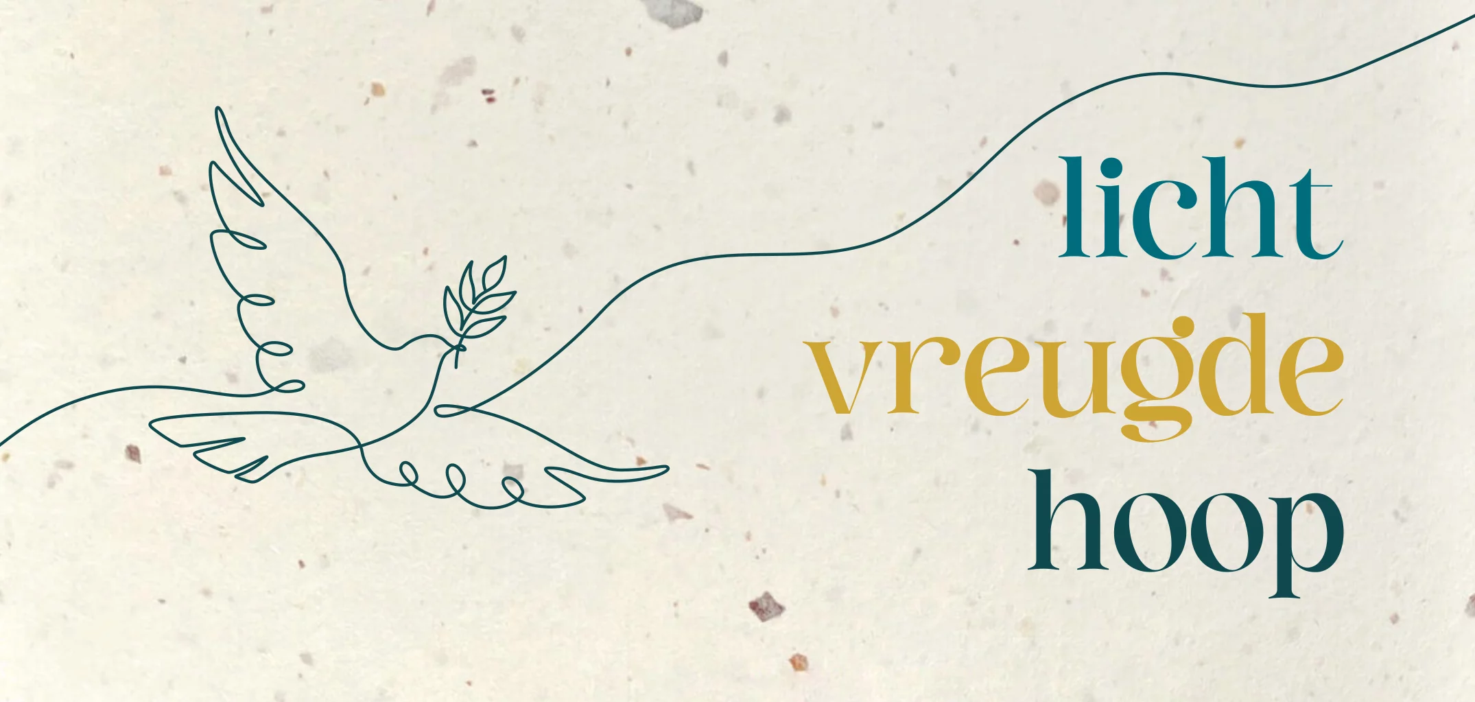 Duurzame kerstkaart gemaakt van tulpenbollenpapier met en lijntekening van een vredesduif met takje en de tekst 'licht, vreugde, hoop'. Deze vredeskaart is zeker ook geschikt als christelijke kerstkaart. Pas de teksten en kleuren naar eigen smaak aan in de editor.