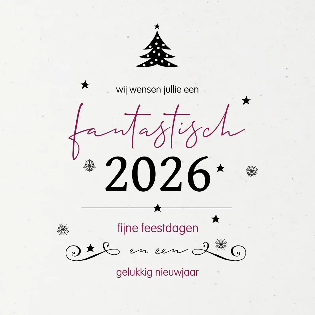 Duurzame kerstkaart met de tekst "Wij wensen jullie een fantastisch 2026" en verschillende kerst illustraties, waaronder een kerstboom en sterretjes. Teksten, lettertypes en kleuren zijn aan te passen in de editor.