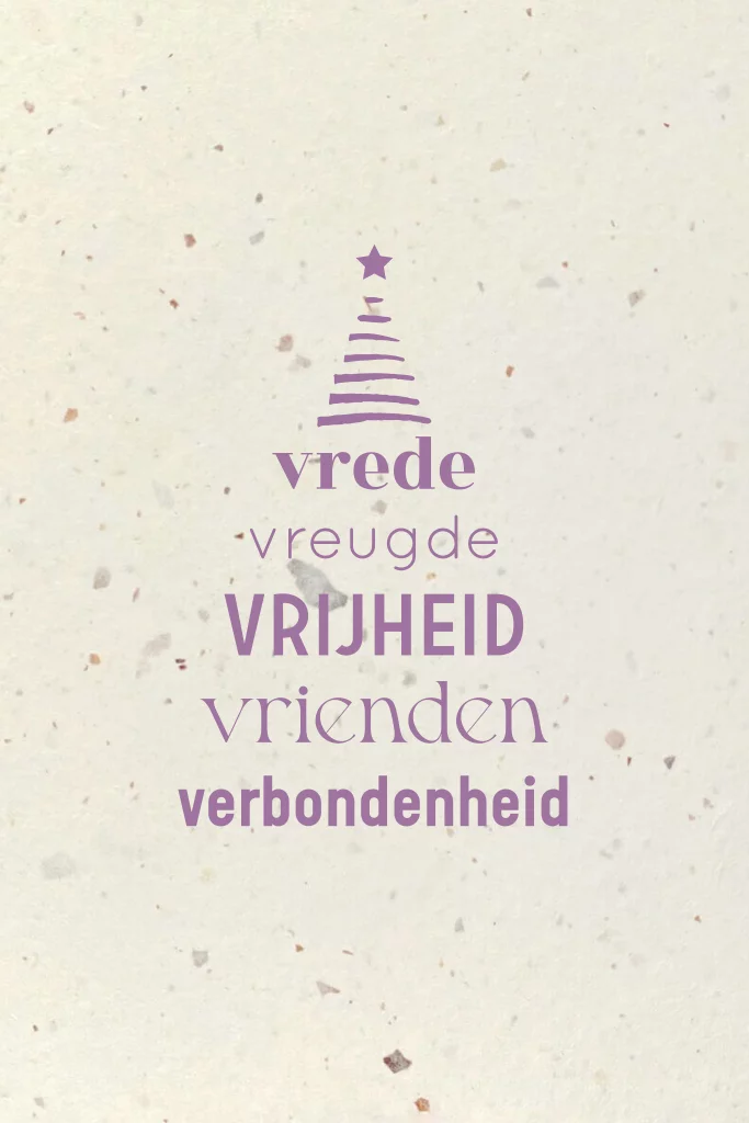 Duurzame kerstkaart gemaakt van tulpenbollenpapier. Op deze kerstkaart zie je de tekst 'vrede, vreugde, vrijheid, vrienden, verbondenheid' in de vorm van een kerstboom. Deze kerstkaart geeft aan dat je vrede en verbondenheid belangrijk vindt. De kaart is ook geschikt als zakelijke kerstkaart. Pas de teksten eenvoudig aan in de editor. Je kunt in de editor ook je eigen bedrijfslogo toevoegen.