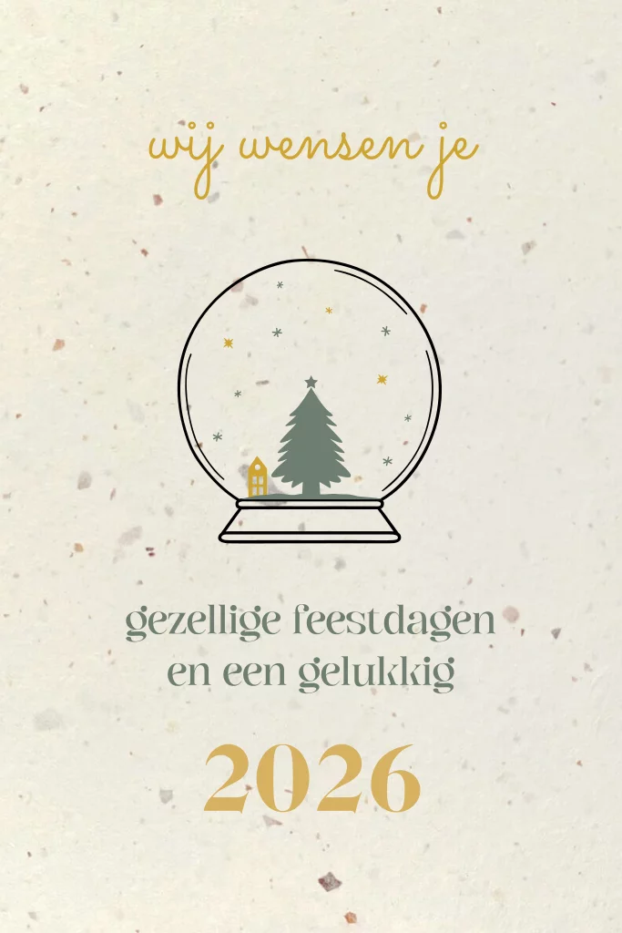 Rustige duurzame kerstkaart met sneeuwbol met daarin een kerstboom en huisje. Teksten, lettertypes en kleuren zijn aan te passen in de editor. Stuur deze kerstkaart naar al je vrienden en familie en wens ze hiermee fijne feestdagen en laat ze zien dat je duurzaamheid en het goede doel belangrijk vindt. Voor elke verkochte kaart doneert Blijkaartje € 0,20 aan het Ronald McDonald Huis Zwolle.