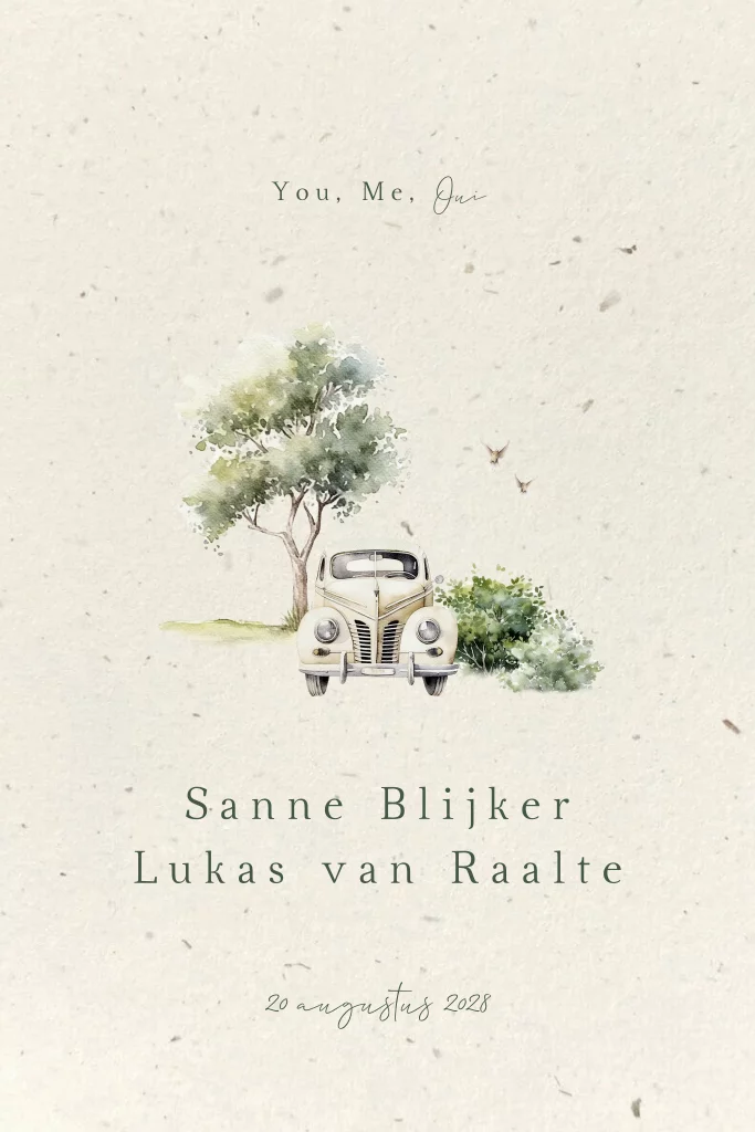 Prachtige originele trouwkaart met een rustig aquarel design op duurzaam papier. Je ziet een landschap van bomen met een oude trouw auto, een oldtimer. Het design is geschilderd met aquarel en geeft een zomerse indruk. De tekst You, Me, Oui past ook perfect voor een zomerbruiloft of een bruiloft in het buitenland zoals een Franse bruiloft in Frankrijk. Gemaakt van 100% Nederlands tulpenbollenpapier, biedt deze kaart een milieuvriendelijke optie voor milieubewuste bruidsparen. Pas de teksten eenvoudig aan in de editor.