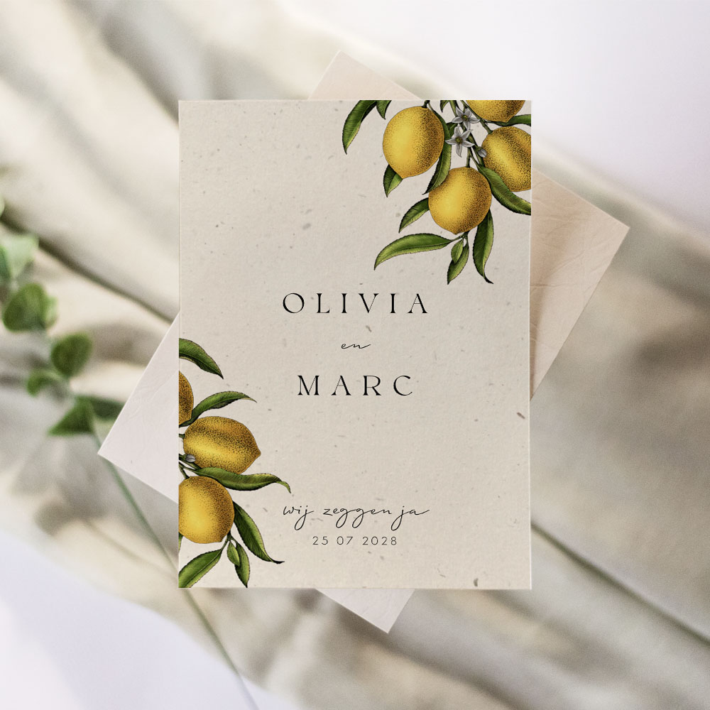 Duurzame trouwkaart gemaakt van tulpenbollenpapier. Deze trouwkaart heeft een prachtig vintage design met geschilderde citroenen. Een perfecte kaart voor een zomerbruiloft of een bruiloft in het buitenland. Pas de teksten eenvoudig aan in de editor.