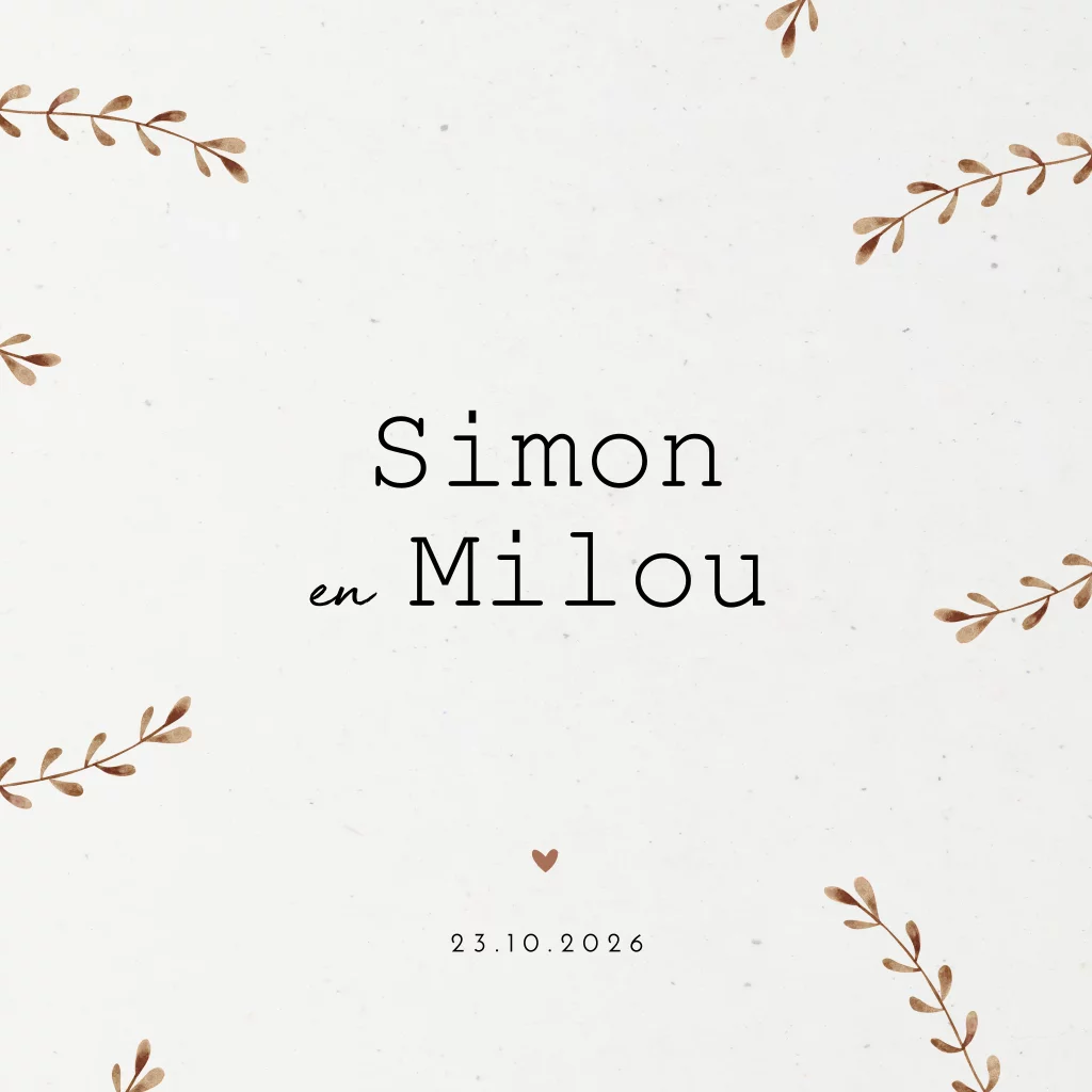 Duurzame trouwkaart die gedrukt wordt op gerecycled papier. Deze huwelijksuitnodiging heeft een basic design met kleine botanische takjes. De teksten en lettertypes zijn aan te passen in de editor.