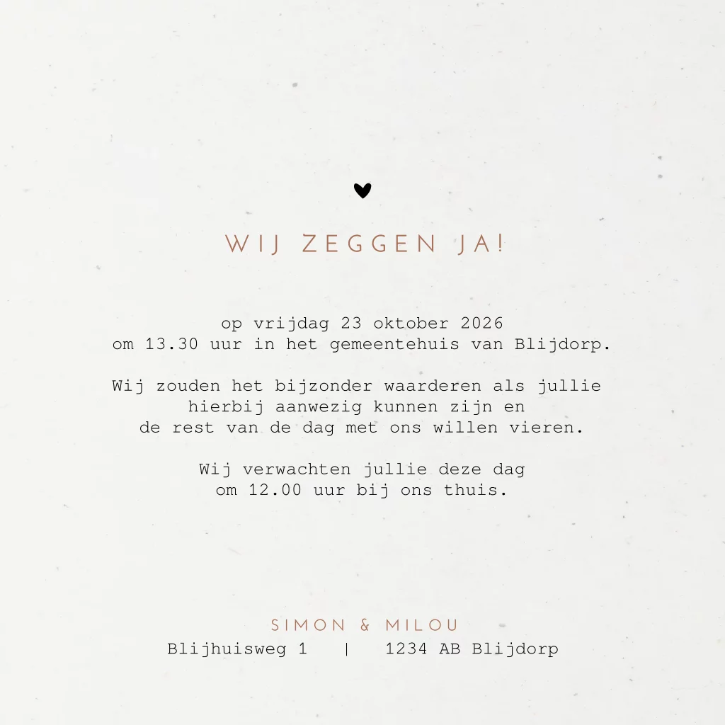 Deze trouwkaart wordt gedrukt op gerecycled papier met zichtbare vezels. Het duurzame papier heeft een grijze ondertoon. Het papier is echter niet ruw en heeft ook geen voelbare structuur.