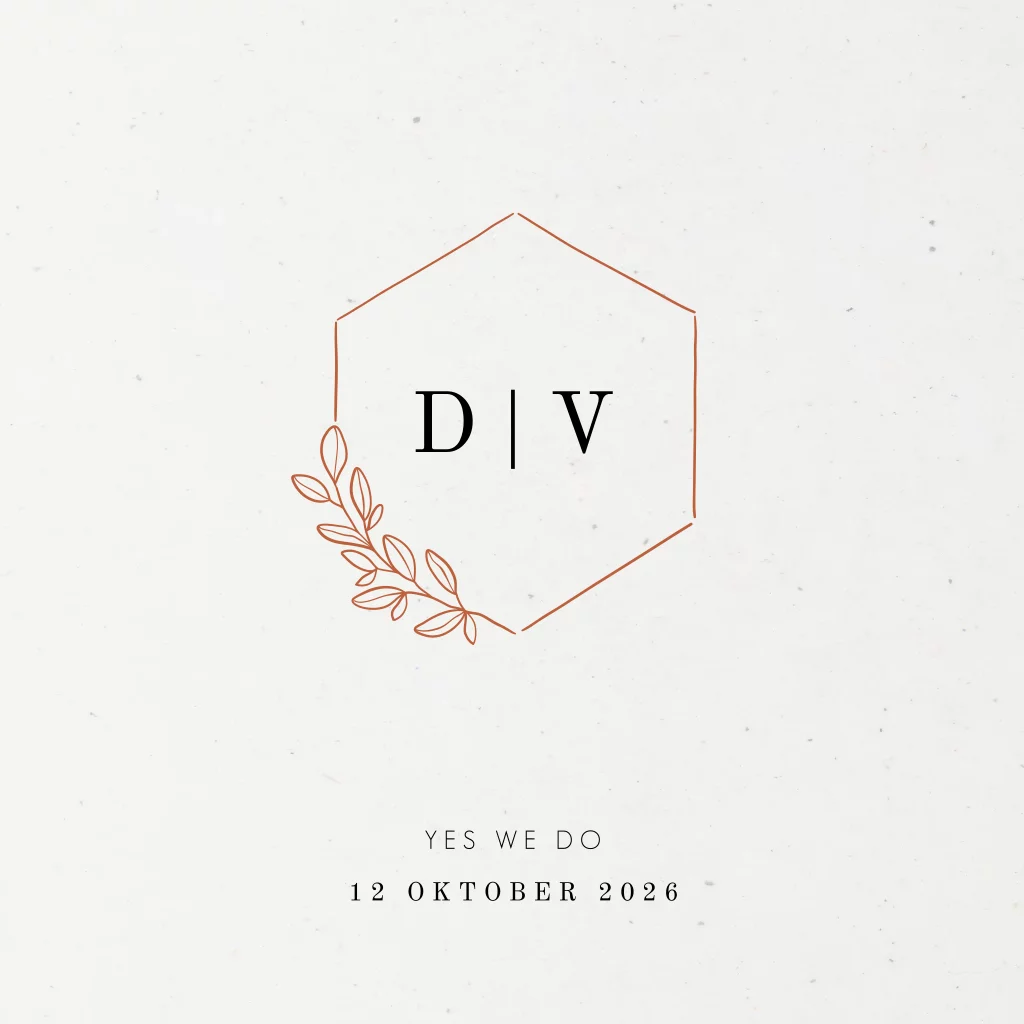 Duurzame trouwkaart die gedrukt wordt op gerecycled papier. Deze huwelijksuitnodiging heeft een basic design. Op de voorzijde staan de initialen van het bruidspaar met daaromheen een zeshoekig kader en een klein takje. Deze kaart is naar je eigen smaak aan te passen in de editor.