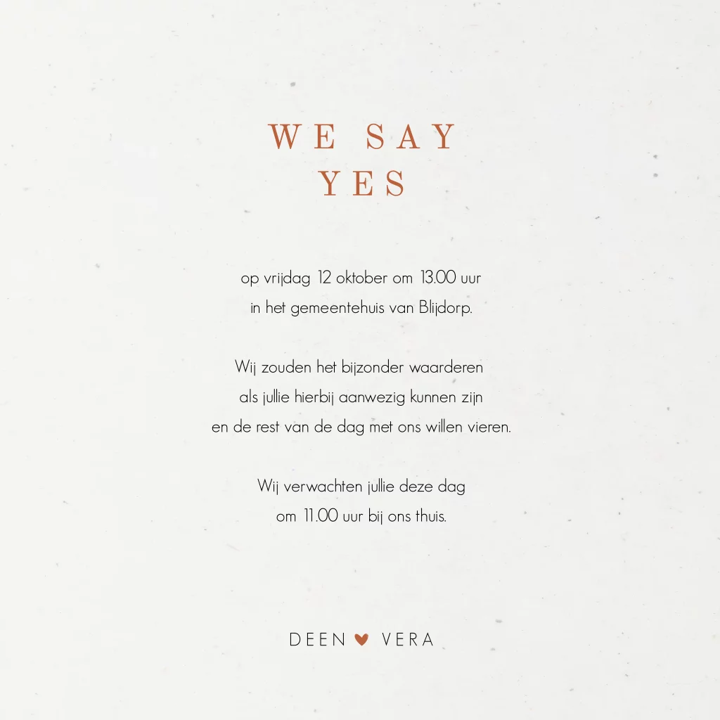 Deze trouwkaart wordt gedrukt op gerecycled papier met zichtbare vezels. Het duurzame papier heeft een grijze ondertoon. Het papier is echter niet ruw en heeft ook geen voelbare structuur.