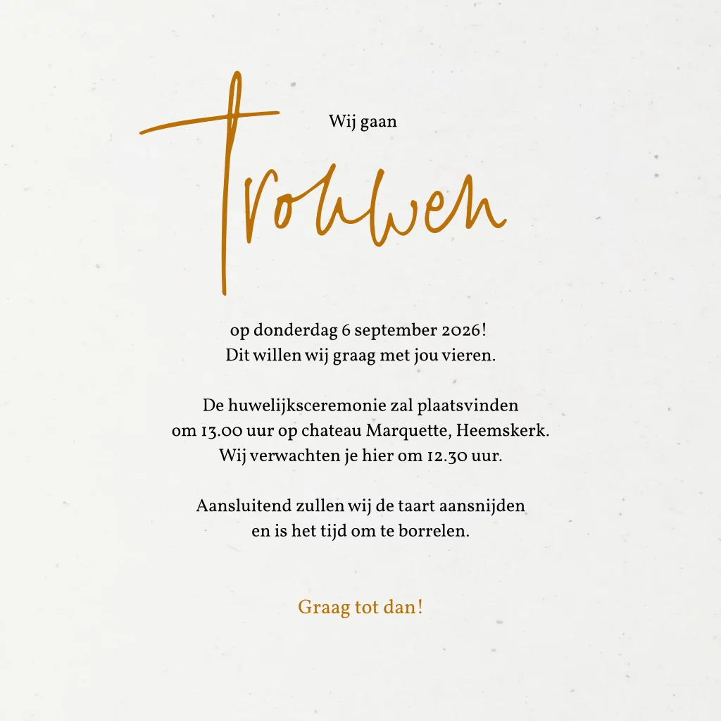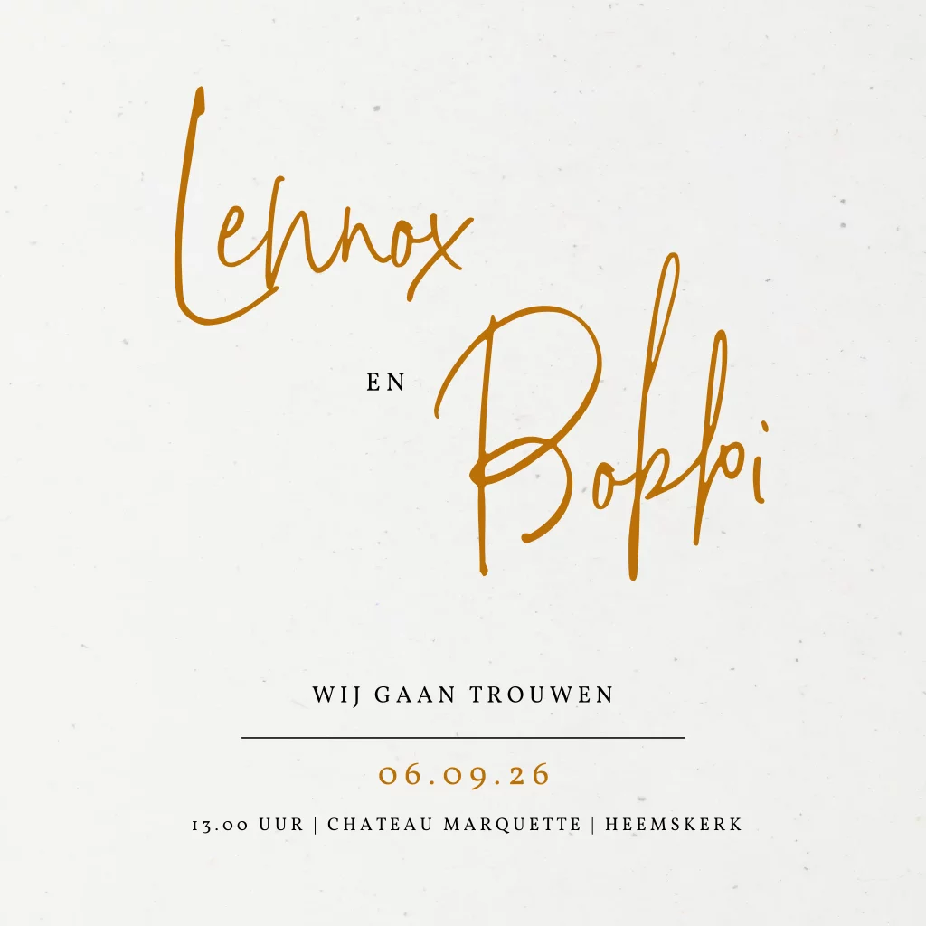 Deze trouwkaart met een basic design wordt gedrukt op gerecycled papier. De namen van het bruidspaar staan in een sierlijk lettertype geschreven in een trendy kleur roestbruin. Verder heeft de kaart een rustige uitstraling en is naar je eigen smaak aan te passen in de editor.