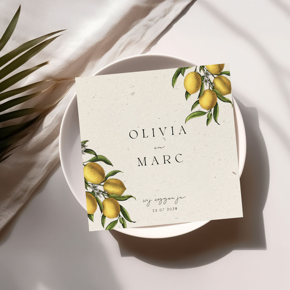 Duurzame vintage trouwkaart gemaakt van tulpenbollenpapier. Deze trouwkaart heeft een stijlvol design met geschilderde citroenen. Een perfecte kaart voor een zomerbruiloft of een bruiloft in het buitenland. Pas de teksten eenvoudig aan in onze online editor.