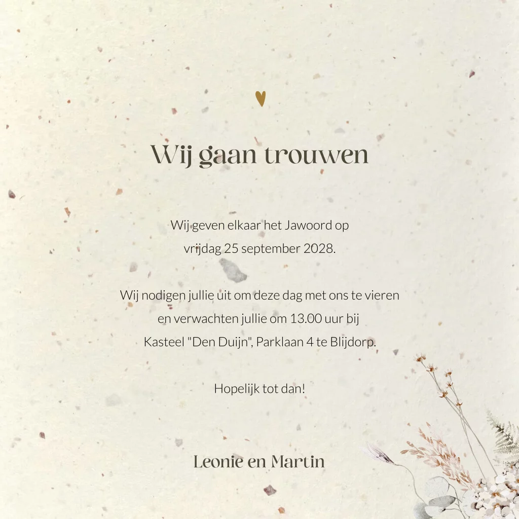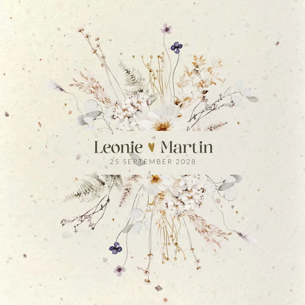 Deze romantische trouwkaart is voorzien van prachtige bloemen met kleine hartjes en wordt gedrukt op gerecycled papier van tulpenbollen. De papiersoort is beige en heeft duidelijk zichtbare vlokken en vezels. Aangezien het een natuurlijk product is kan er een uitstraling- en kleurverschil zitten tussen verschillende oplages van drukwerk. Wij adviseren je om, voordat je een grotere oplage bestelt, eerst een drukproef van het ontwerp te bestellen zodat je het duurzame papier gecombineerd met het drukwerk goed kunt beoordelen. LET OP: kies je voor een andere duurzaam papiersoort dan heeft dat gevolgen voor de (achtergrond)kleuren van je ontwerp.