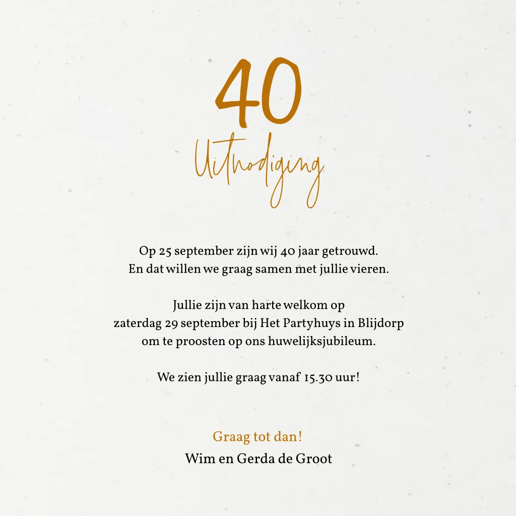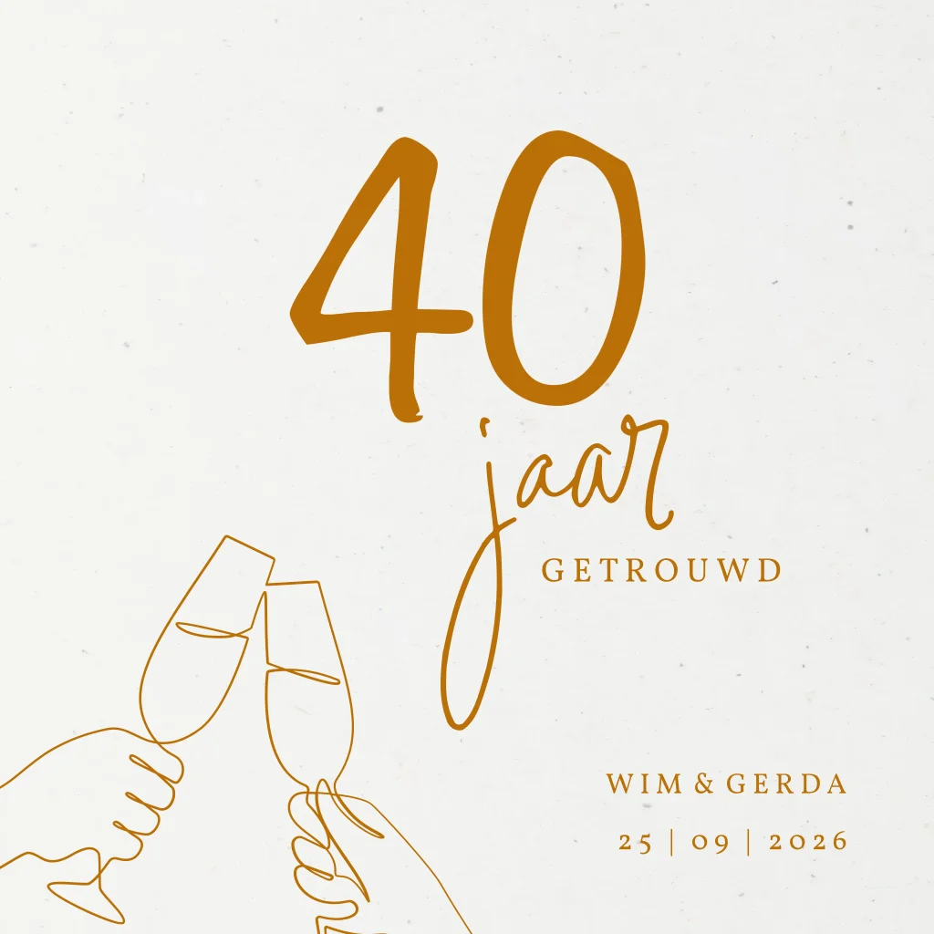 Uitnodiging voor een 40-jarig huwelijksjubileum. Op deze jubileumkaart staat een one line afbeelding van proostende glazen. Verder heeft de kaart een rustige uitstraling en is naar je eigen smaak aan te passen in de editor.