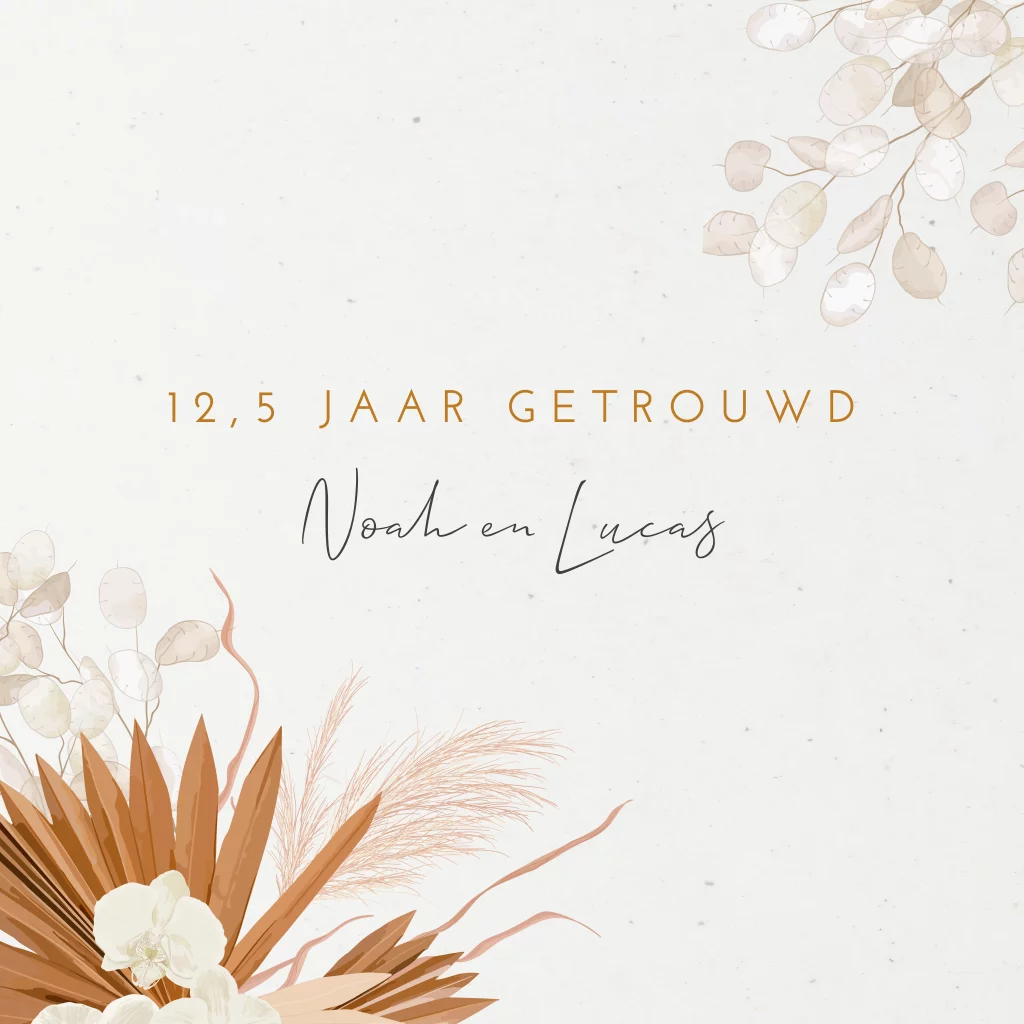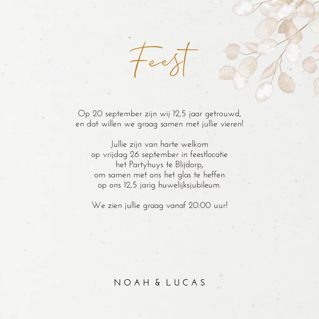 Duurzame jubileumkaart voor een 12,5-jarig huwelijk die gedrukt wordt op gerecycled papier. Deze jubileumuitnodiging heeft een rustig design met mooie gedroogde bloemen. Deze uitnodigingskaart is ook geschikt voor andere bruiloftsjaren of wanneer je wilt vieren dat je 12,5 jaar samen bent. De teksten en lettertypes zijn aan te passen in de editor.