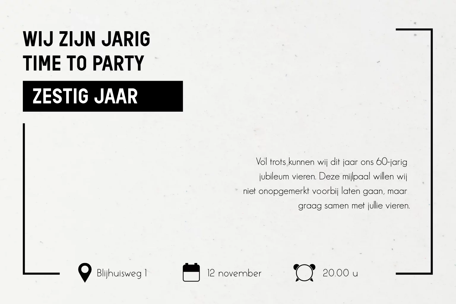 Een zeer geschikte uitnodiging op duurzaam papier voor bedrijven die duurzaam ondernemen. Op deze zakelijke uitnodiging voor een 60-jarig jubileum staat een strak design waardoor de uitnodiging een rustige uitstraling heeft. Vier hiermee dat jullie jarig zijn, time to party! Plaats daarnaast een eigen bedrijfslogo op de achterzijde van de uitnodiging. De afbeelding van het logo dient als voorbeeld en wordt niet gedrukt. Deze kun je verwijderen of plaats hier je eigen logo overheen. De teksten en kleuren zijn aan te passen in de editor.