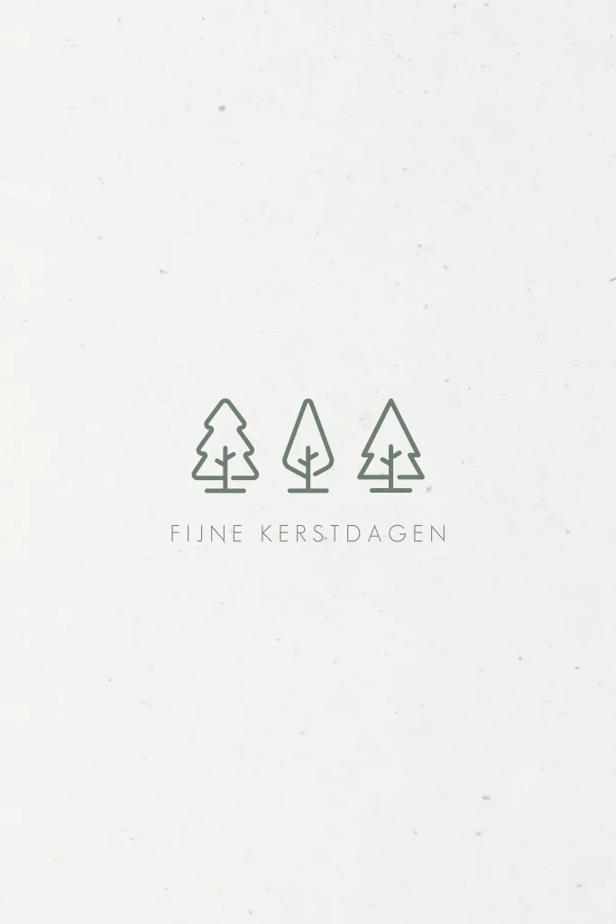 Rustige duurzame zakelijke kerstkaart met drie minimalistische kerstbomen en de tekst fijne kerstdagen. Teksten, lettertypes en kleuren zijn aan te passen in de editor. Op de achterzijde is ruimte om een bedrijfslogo toe te voegen. Geschikt voor bedrijven in de branche groen en natuur zoals een Hoveniersbedrijf.
