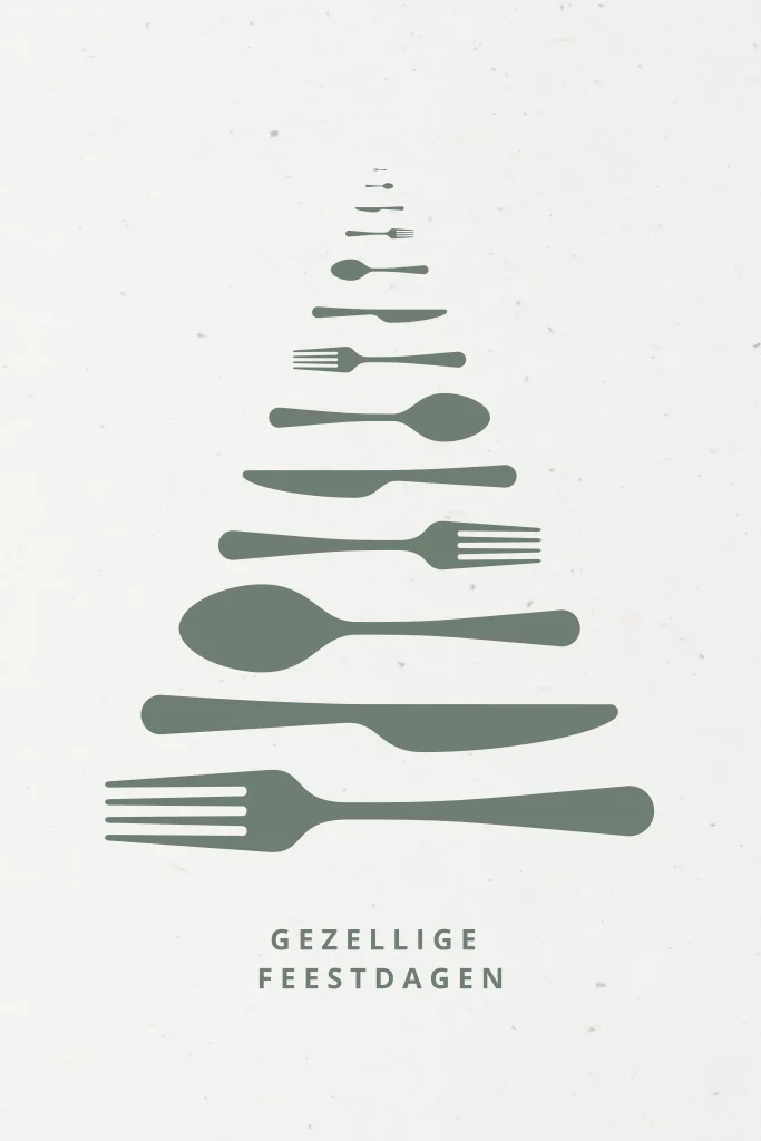 Rustige duurzame zakelijke kerstkaart met minimalistische kerstboom welke bestaat uit bestek (een vork, mes en lepel) en de tekst gezellige feestdagen. Teksten, lettertypes en kleuren zijn aan te passen in de editor. Op de achterzijde is ruimte om een bedrijfslogo toe te voegen. Geschikt voor bedrijven in de horeca branche.