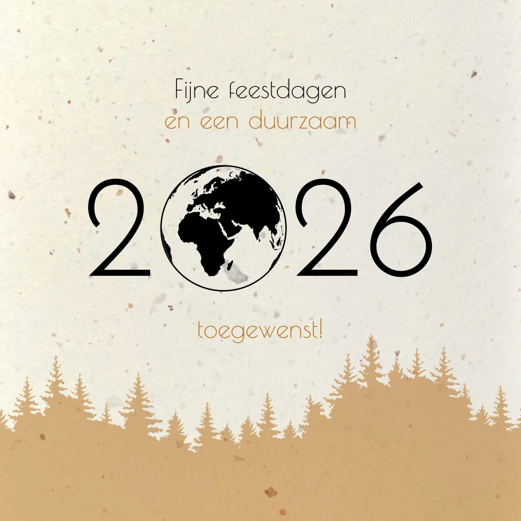 Duurzame zakelijke kerstkaart op duurzaam papier. Op deze kaart de toepasselijke tekst 'Fijne feestdagen en een duurzaam 2026 toegewenst' met in het jaartal een wereldbol. Onderaan de kaart staan dennenbomen afgebeeld.