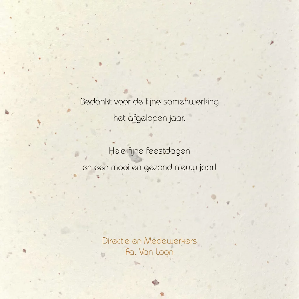 Deze zakelijke kerstkaart is een 100% Nederlands product en wordt gedrukt op gerecycled papier welke voor 20% uit tulpenbollen bestaat, aangevuld met houtvrije cellulose. De papiersoort is beige en heeft duidelijk zichtbare vlokken en vezels. Aangezien het een natuurlijk product is kan er een uitstraling- en kleurverschil zitten tussen verschillende oplages van drukwerk. Wij adviseren je om, voordat je een grotere oplage bestelt, eerst een drukproef van het ontwerp te bestellen zodat je het duurzame papier gecombineerd met het drukwerk goed kunt beoordelen. LET OP: kies je voor een andere duurzaam papiersoort dan heeft dat gevolgen voor de (achtergrond)kleuren van je ontwerp.
