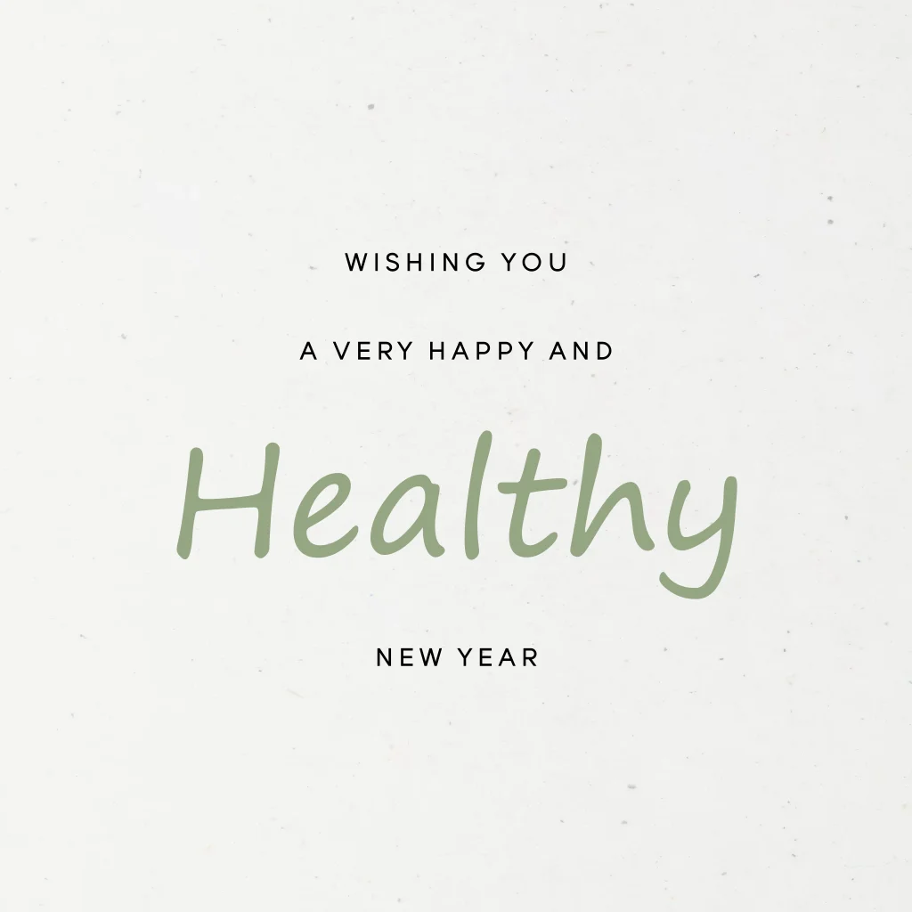Duurzame zakelijke kerstkaart met de tekst "Wishing you a healthy New Year". De teksten, lettertypes en kleuren zijn aan te passen in de editor. Geschikt voor alle branches.