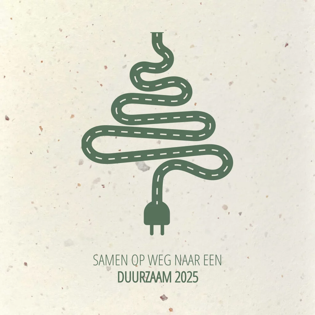 Duurzame zakelijke kerstkaart met een stekker als autoweg in vorm van een kerstboom. Deze zakelijke duurzame kerstkaart is geschikt voor bedrijven in de transport en logistiek. Pas de teksten en kleuren naar eigen smaak aan in de editor.