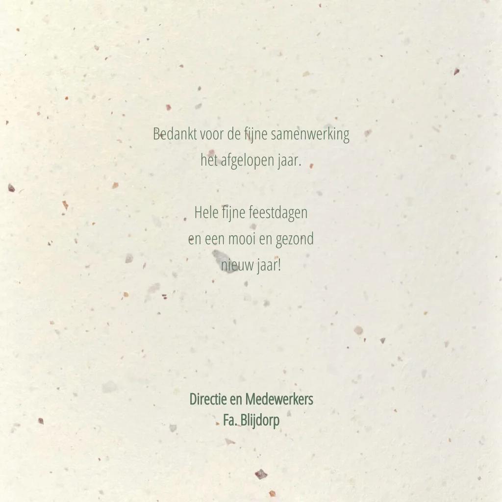 Deze zakelijke kerstkaart is een 100% Nederlands product en wordt gedrukt op gerecycled papier welke voor 20% uit tulpenbollen bestaat, aangevuld met houtvrije cellulose. De papiersoort is beige en heeft duidelijk zichtbare vlokken en vezels. Aangezien het een natuurlijk product is kan er een uitstraling- en kleurverschil zitten tussen verschillende oplages van drukwerk. Wij adviseren je om, voordat je een grotere oplage bestelt, eerst een drukproef van het ontwerp te bestellen zodat je het duurzame papier gecombineerd met het drukwerk goed kunt beoordelen. LET OP: kies je voor een andere duurzaam papiersoort dan heeft dat gevolgen voor de (achtergrond)kleuren van je ontwerp.
