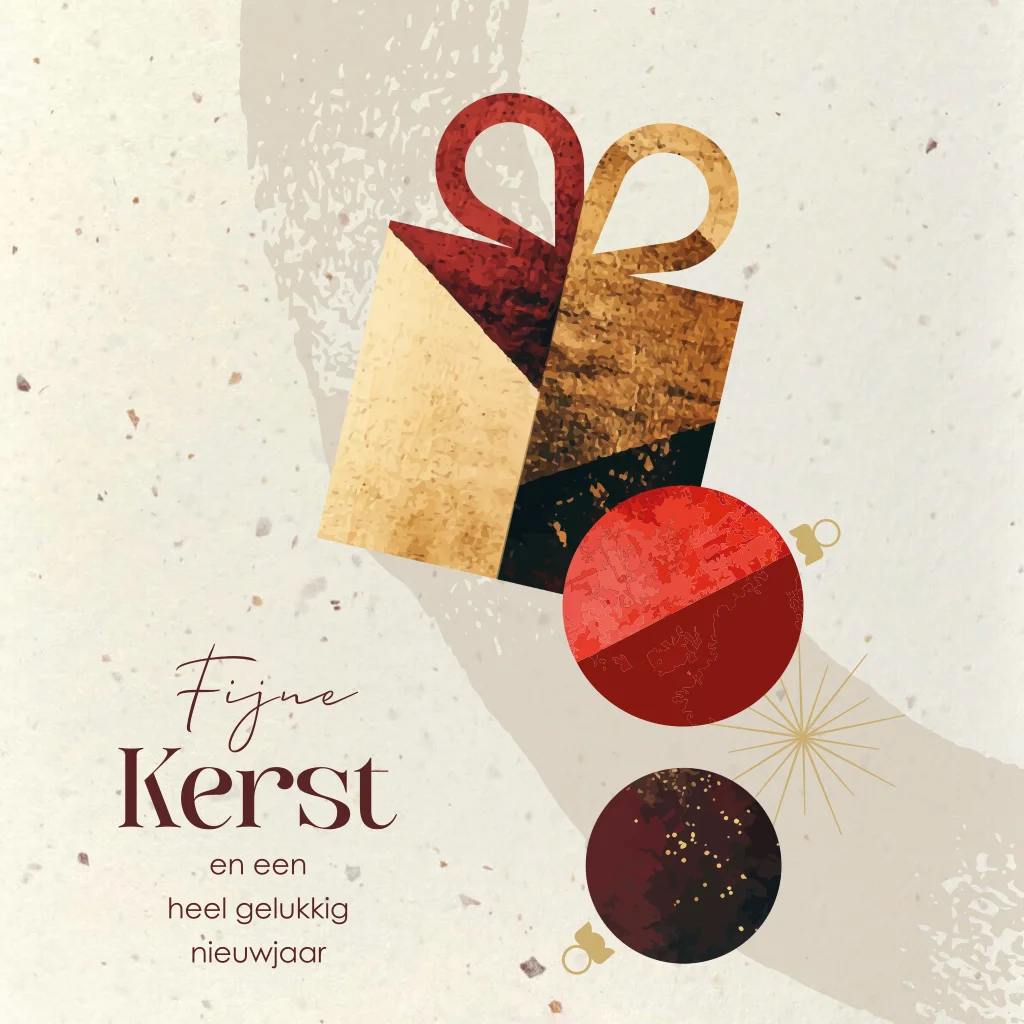 Wens je zakelijke relaties een fijne Kerst en een heel gelukkig nieuwjaar met deze duurzame zakelijke kerstkaart op tulpenbollenpapier. Op de kaart staat een cadeau met kerstballen. Deze zakelijke kerstkaart is geschikt voor alle branches. Op de binnenzijde is ruimte voor een eigen bedrijfslogo. De afbeelding van het logo dient als voorbeeld en wordt niet gedrukt. Deze kun je verwijderen of plaats hier je eigen logo overheen.