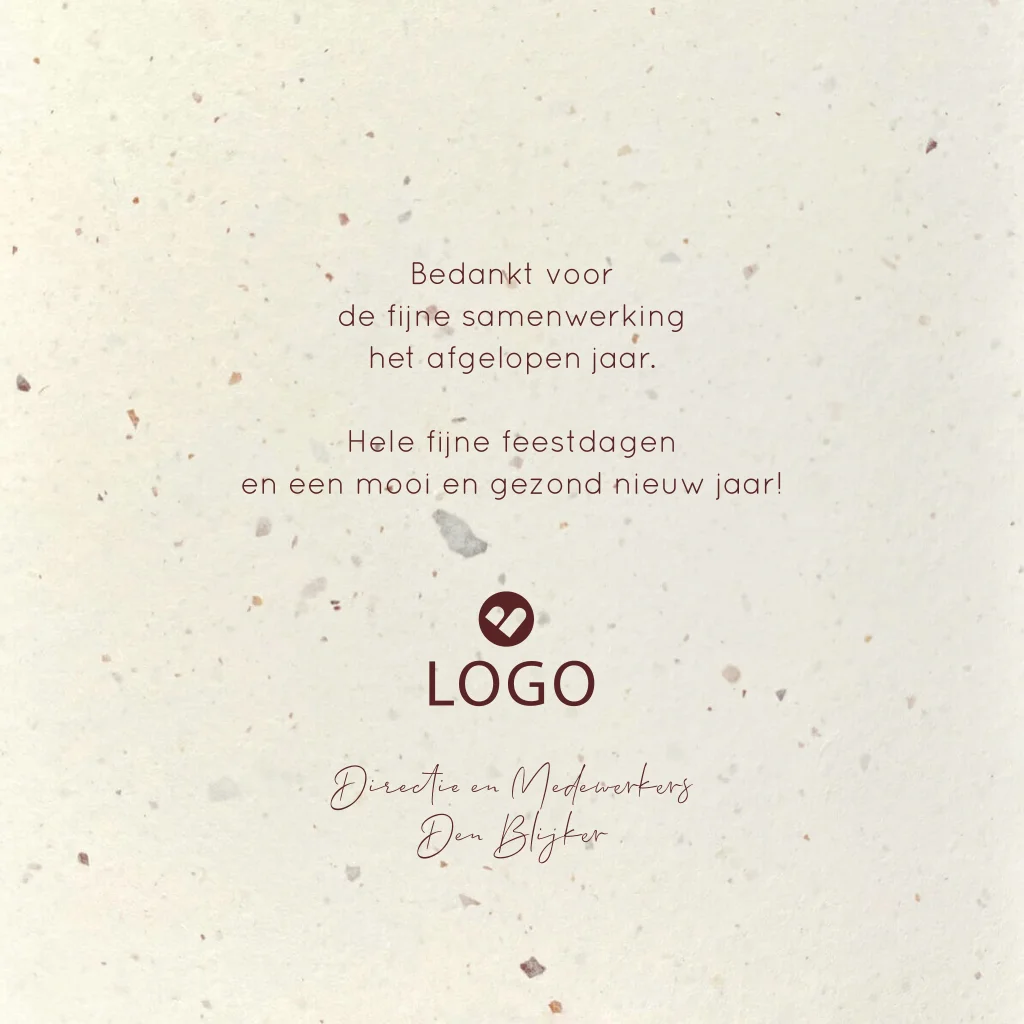 Dit kaartje is een 100% Nederlands product en wordt gedrukt op gerecycled papier welke voor 20% uit tulpenbollen bestaat, aangevuld met houtvrije cellulose. De papiersoort is beige en heeft duidelijk zichtbare vlokken en vezels. Aangezien het een natuurlijk product is kan er een uitstraling- en kleurverschil zitten tussen verschillende oplages van drukwerk. Wij adviseren je om, voordat je een grotere oplage bestelt, eerst een drukproef van het ontwerp te bestellen zodat je het duurzame papier gecombineerd met het drukwerk goed kunt beoordelen. LET OP: kies je voor een andere duurzaam papiersoort dan heeft dat gevolgen voor de (achtergrond)kleuren van je ontwerp.