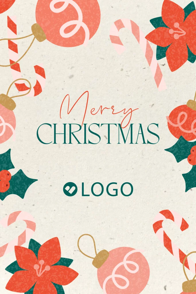 Duurzame zakelijke kerstkaart, gemaakt van hoogwaardig tulpenbollenpapier. Deze kerstkaart is geschikt voor verschillende branches. Op deze kaart zie je prachtige rode kerstballen, verschillende kersttakjes en zuurstokken. Deze elementen geven de kaart een warme en traditionele uitstraling. Voeg je eigen bedrijfslogo op de voorzijde toe voor een persoonlijk tintje. Pas eenvoudig de teksten aan in de editor en maak deze kaart helemaal eigen.