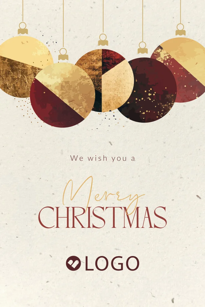 Duurzame zakelijke kerstkaart, gemaakt van hoogwaardig tulpenbollenpapier. Deze kerstkaart is geschikt voor verschillende branches. Op deze kaart zie je prachtige kerstballen in goudlook. Voeg je eigen bedrijfslogo op de voorzijde toe voor een persoonlijk tintje. Pas eenvoudig de teksten aan in de editor en maak deze kaart helemaal eigen.