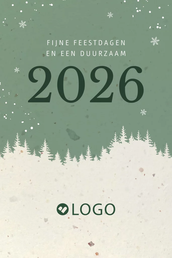 Duurzaam zakelijke kerstkaart van tulpenbollen papier met kerstbomen, sneeuw en jaartal 2026. Deze zakelijke kaart is helemaal geschikt voor bedrijven die duurzaamheid voorop hebben staan. Pas de teksten en kleuren naar eigen smaak aan in de editor. Op de voor- en binnenzijde is er ruimte voor een eigen bedrijfslogo.