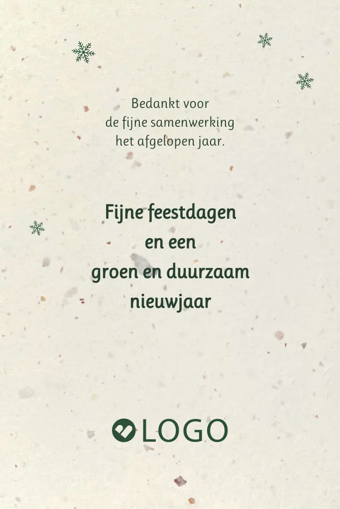 Deze zakelijke kerstkaart is een 100% Nederlands product en wordt gedrukt op gerecycled papier welke voor 20% uit tulpenbollen bestaat, aangevuld met houtvrije cellulose. De papiersoort is beige en heeft duidelijk zichtbare vlokken en vezels. Aangezien het een natuurlijk product is kan er een uitstraling- en kleurverschil zitten tussen verschillende oplages van drukwerk. Wij adviseren je om, voordat je een grotere oplage bestelt, eerst een drukproef van het ontwerp te bestellen zodat je het duurzame papier gecombineerd met het drukwerk goed kunt beoordelen. LET OP: kies je voor een andere duurzaam papiersoort dan heeft dat gevolgen voor de (achtergrond)kleuren van je ontwerp.