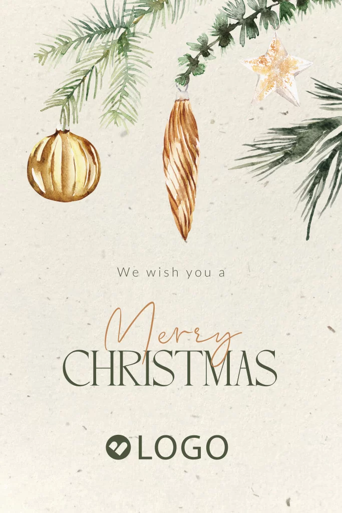 Duurzame zakelijke kerstkaart, gemaakt van hoogwaardig tulpenbollenpapier. Deze kerstkaart is geschikt voor verschillende branches. Op deze kaart zie je prachtige kerstballen en verschillende takjes. Voeg je eigen bedrijfslogo op de voorzijde toe voor een persoonlijk tintje. Pas eenvoudig de teksten aan in de editor en maak deze kaart helemaal eigen.