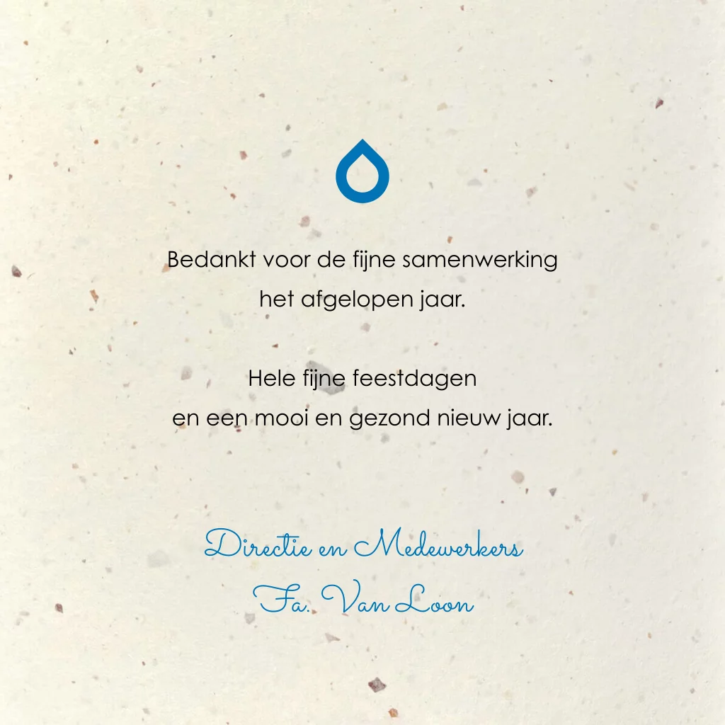Zakelijke kerstkaart op duurzaam papier. Deze zakelijke kaart heeft een basic design. Op de voorzijde de tekst 'Merry Christmas' met een waterdruppel. Deze kaart is geschikt voor bedrijven in de installatiebranche zoals een loodgietersbedrijf. Stuur deze zakelijke kerstkaart naar al je zakelijke relaties en wens ze hiermee fijne feestdagen en laat ze zien dat je duurzaamheid belangrijk vindt.
