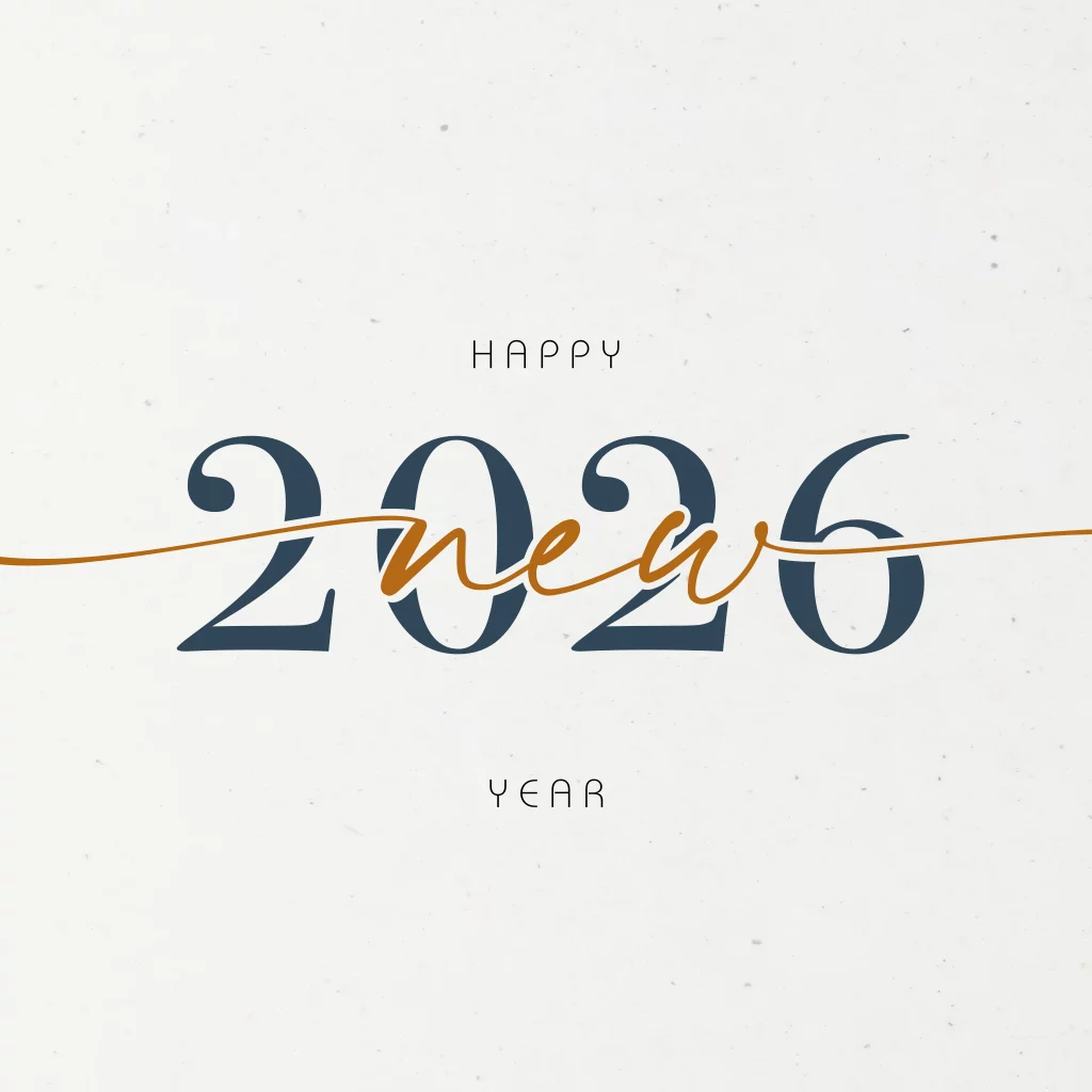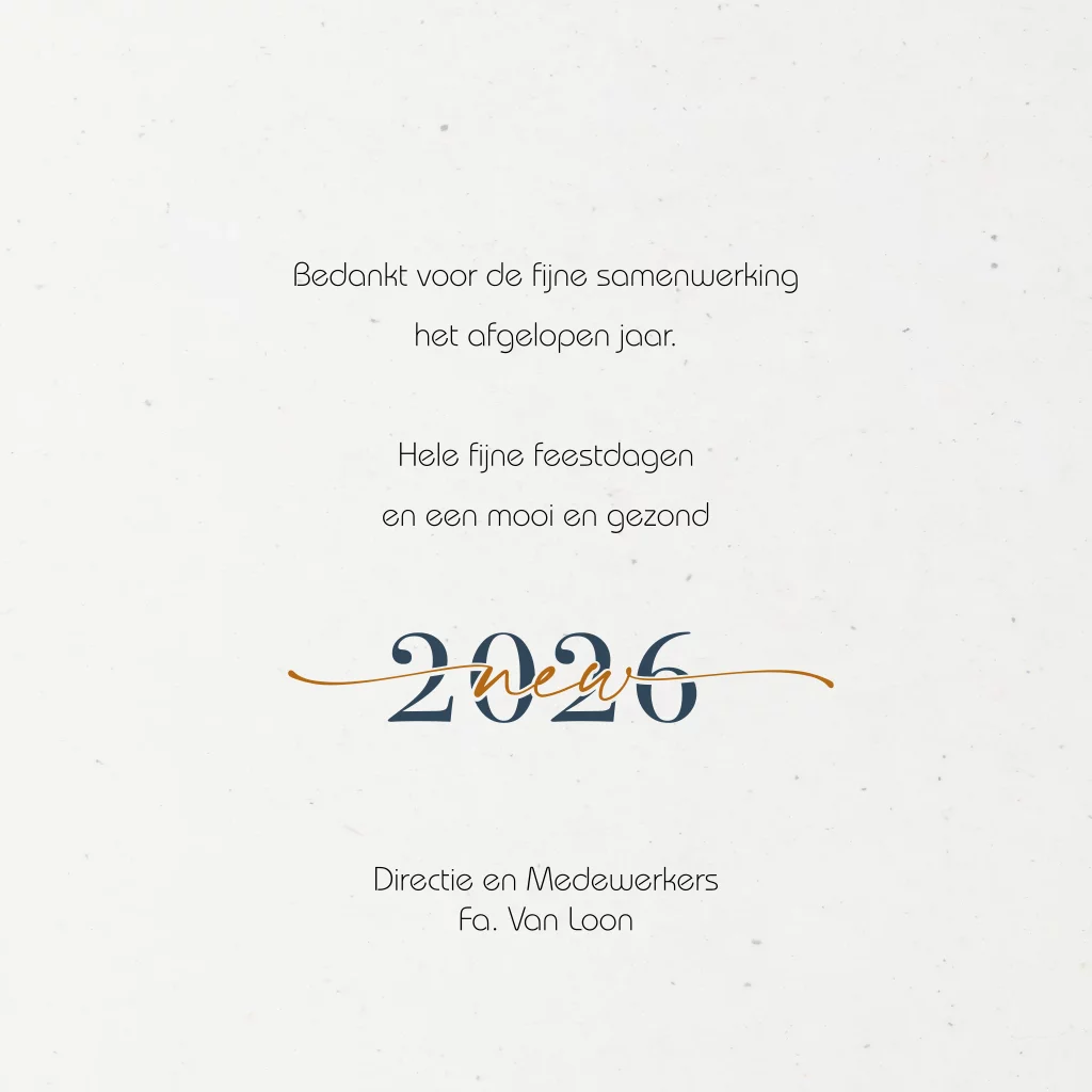 Duurzame zakelijke kerstkaart met happy new year en het jaartal 2026. Deze kaart is voor alle branches geschikt en op de binnenzijde is ruimte om een bedrijfslogo toe te voegen. Pas de teksten en kleuren naar eigen smaak aan in de editor.