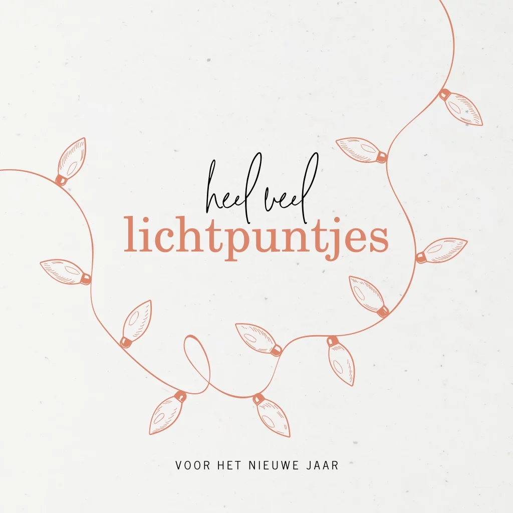 Duurzame zakelijke kerstkaart met de tekst "Heel veel lichtpuntjes voor het nieuwe jaar". Deze kaart is voor alle branches geschikt en op de binnenzijde is ruimte om een bedrijfslogo toe te voegen. Pas de teksten en kleuren naar eigen smaak aan in de editor.