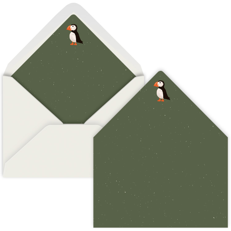 Deze inlay met een schattige papegaaiduiker is een perfecte toevoeging aan je uitgekozen geboortekaartje. Je ziet op de inlay een geïllustreerde papegaaiduiker met een donkergroene achtergrond.