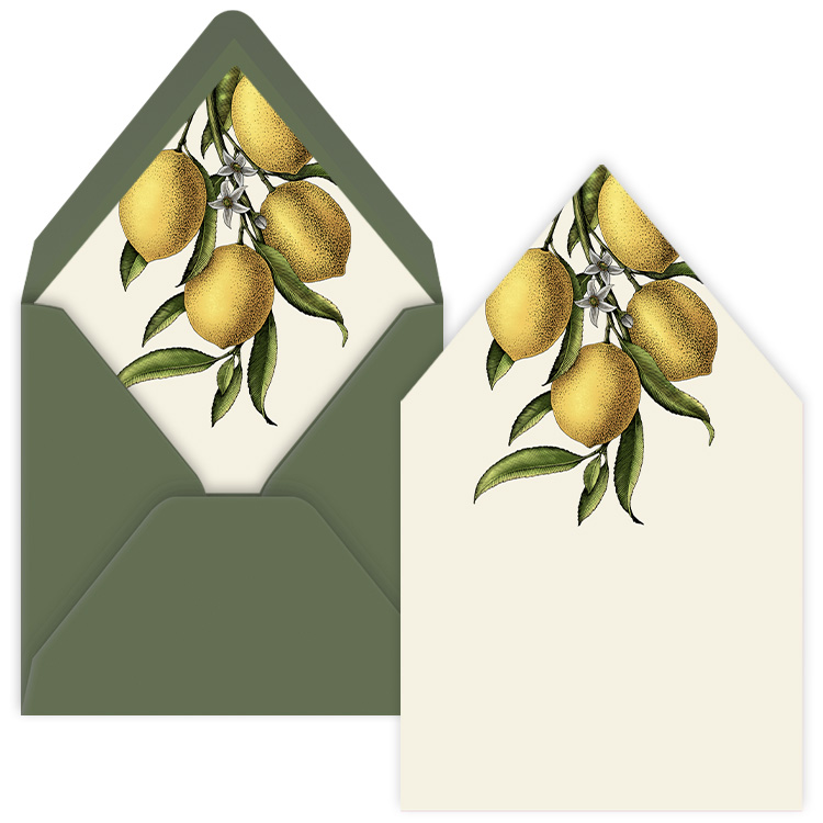 Deze inlay voor in een envelop kun je geheel in stijl van je uitgekozen trouwkaart of uitnodiging gebruiken. Je ziet een vintage illustratie van citrusvruchten, namelijk citroenen.| Totaalprijs: 0 |