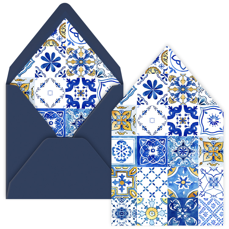 Maak je trouwkaart of uitnodiging helemaal af met een mooie bijpassende envelop. Deze inlay is geschikt om in de envelop te plakken. De Portugese tegeltjes en sierlijke details geven een uniek en stijlvol tintje aan de envelop, waardoor je uitnodiging direct opvalt.