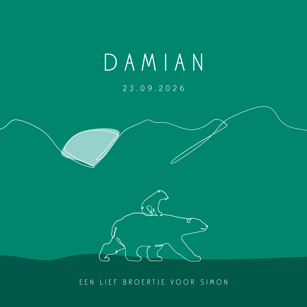 Luxe geboortekaartje met foliedruk voor een zoon en broertje! Op dit jongenskaartje Damian een outline beer met een klein berenjong op zijn rug. De beren en de babynaam worden gedrukt in écht goudfolie, dit maakt het kaartje extra speciaal. Je kunt de foliekleur zelf wijzigen in de editor.