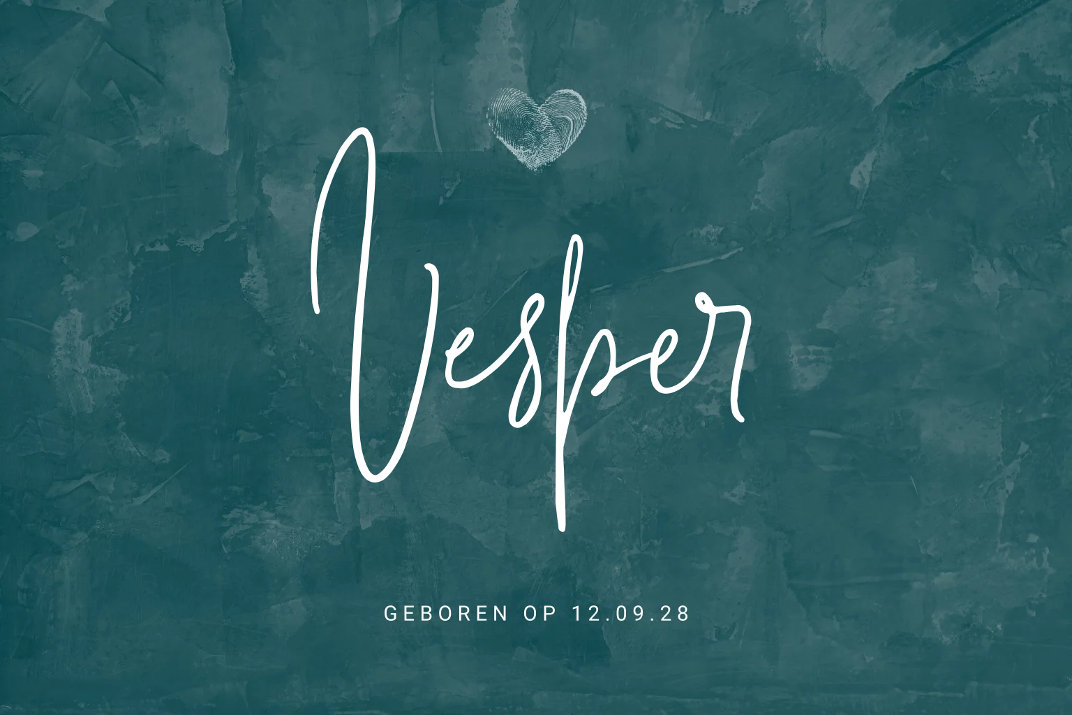 Stoer en stijlvol geboortekaartje voor een jongen met een basic design met fingerprint hartje, geïnspireerd op het geboortekaartje van de zoon van Anne Vedder. De combinatie van goudfolie met de stoere blauwe betonlook achtergrond maakt dit geboortekaartje Vesper uniek en stijlvol. Met de mogelijkheid om dit vingerafdruk geboortekaartje naar eigen smaak aan te passen in de editor, kunnen ouders het kaartje helemaal personaliseren. Voeg bijvoorbeeld een extra touch toe met de envelop in de kleur petrol, die perfect past bij het stoere en luxe thema van het kaartje.