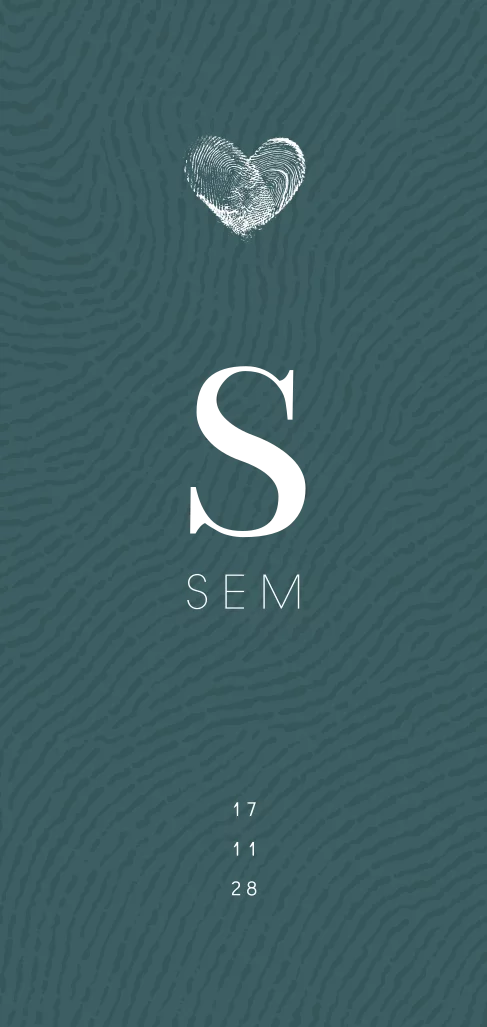 Jongens geboortekaartje met initiaal, fingerprint en foliedruk. Dit langwerpige geboortekaartje Sem heeft een vingerafdruk achtergrond met een hartje van twee vingerafdrukken en is geïnspireerd op het geboortekaartje van Anne Vedder. De goudfolie geeft een luxe uitstraling en is een mooie combinatie met de blauwe achtergrond. Teksten en kleuren zijn makkelijk aan te passen in onze editor. Maak het geheel af met een petrol kleur envelop en bijpassende sluitzegel. Hulp nodig? We staan voor je klaar!
