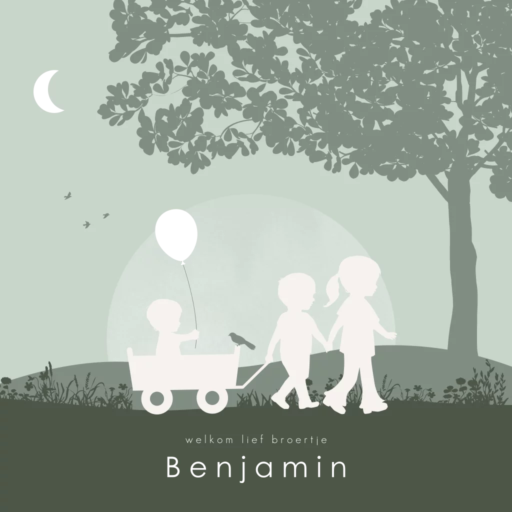 Silhouet geboortekaartje voor een derde kindje. Op dit jongenskaartje met de naam Benjamin zie je de silhouetten van een grote zus, een grote broer en een klein baby broertje in een karretje. Het kleine jongetje heeft een ballon in zijn hand. Extra bijzonder aan dit kaartje is dat de ballon, de maan en de babynaam gedrukt worden in echt goudfolie. De kleuren en silhouetten kun je aanpassen. Ook mogelijk voor een andere gezinssamenstelling? Hulp nodig? Laat het gerust weten.
