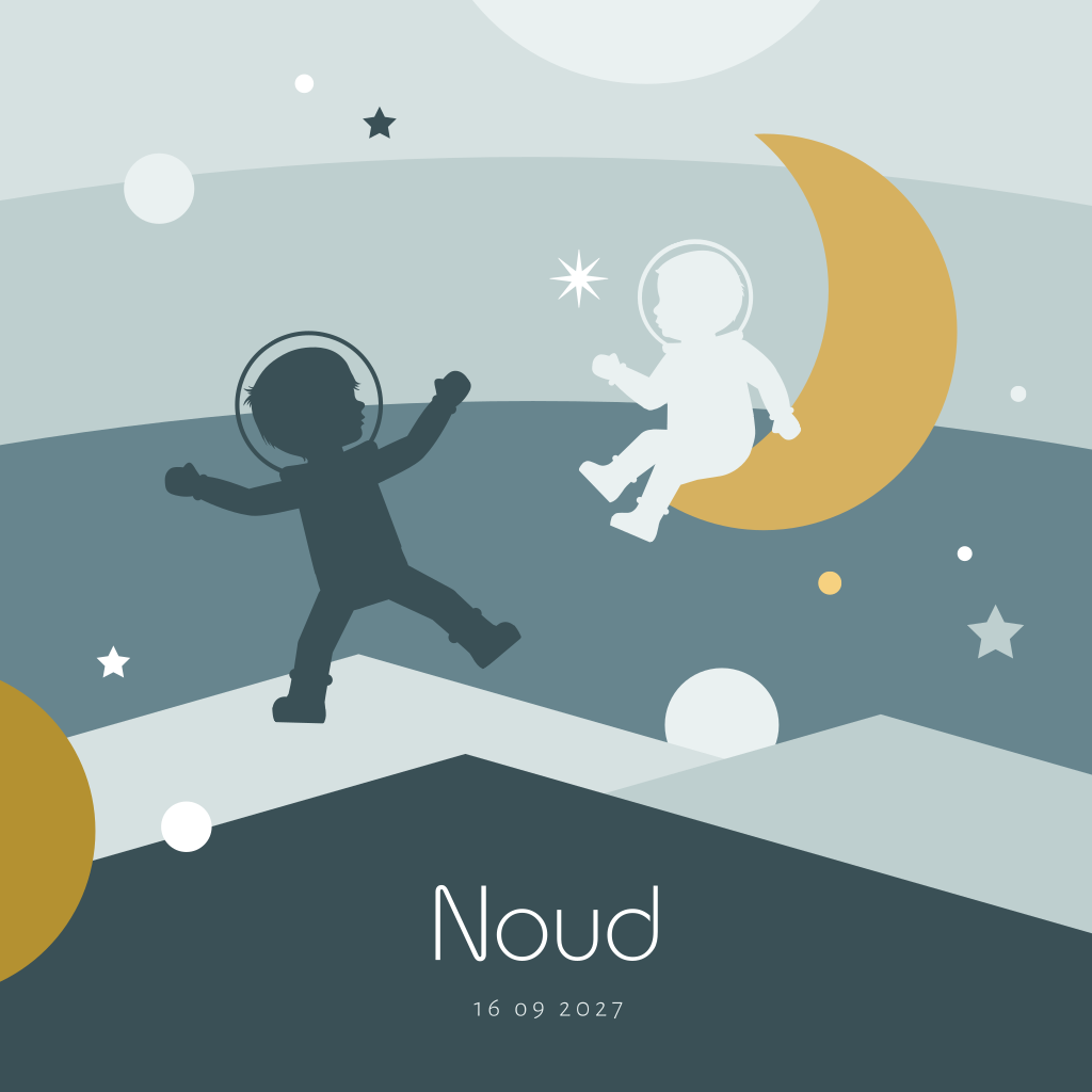 Silhouet geboortekaartje voor een tweede zoon, een broertje! Op dit babykaartje Noud zweven twee broers als echte astronauten door de ruimte. De ruimte heeft stoere blauwe ton sur ton kleuren. Ze hebben beide een ruimtepak aan en astronauten helm op. Om hen heen zweven verschillende planeten, sterren en de maan. Extra bijzonder aan dit jongenskaartje is de goudfolie. Dat geeft een luxe uitstraling aan dit ruimte kaartje. Teksten en kleuren, evenals de silhouetten zijn aan te passen in de editor. Ook mogelijk voor een andere gezinssamenstelling.