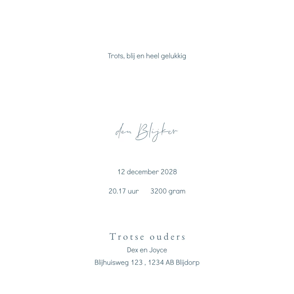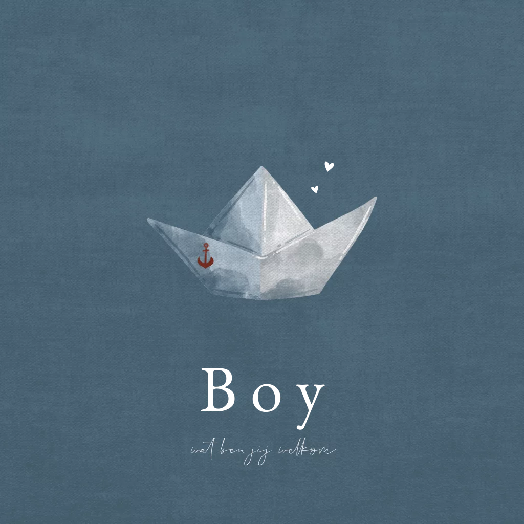 Een dromerig geboortekaartje voor een jongen met goud foliedruk en een linnenlook achtergrond. Op dit blauwe jeanslook geboortekaartje Boy zie je een illustratie van een gevouwen papieren bootje met twee hartjes erboven. Dit rustige geboortekaartje is geschikt voor de geboorte van jullie zoon. Pas dit geboortekaartje naar eigen wens aan in de online editor.