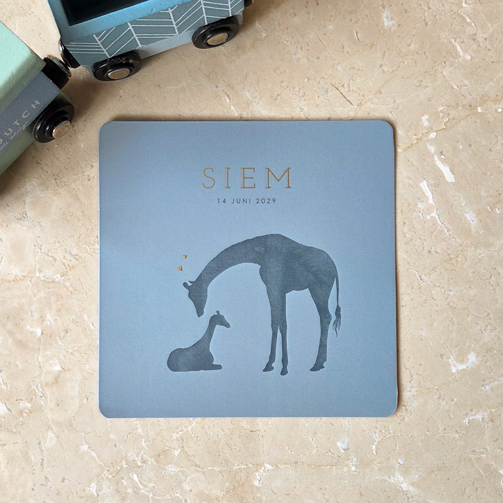 Geboortekaartje met silhouet en ronde hoeken voor een zoon. Op dit silhouet kaartje Siem zie je een moeder giraffe met haar baby jongen. Dit kaartje heeft een blauwe achtergrond en de silhouetjes hebben een donkerblauwe kleur. Dit kaartje is overwegend rustig. De goudfolie en ronde hoeken maken dit geboortekaartje voor een jongen helemaal af. Pas de teksten, lettertypes en folie gemakkelijk aan in de editor. Hulp nodig? Wij helpen je graag!