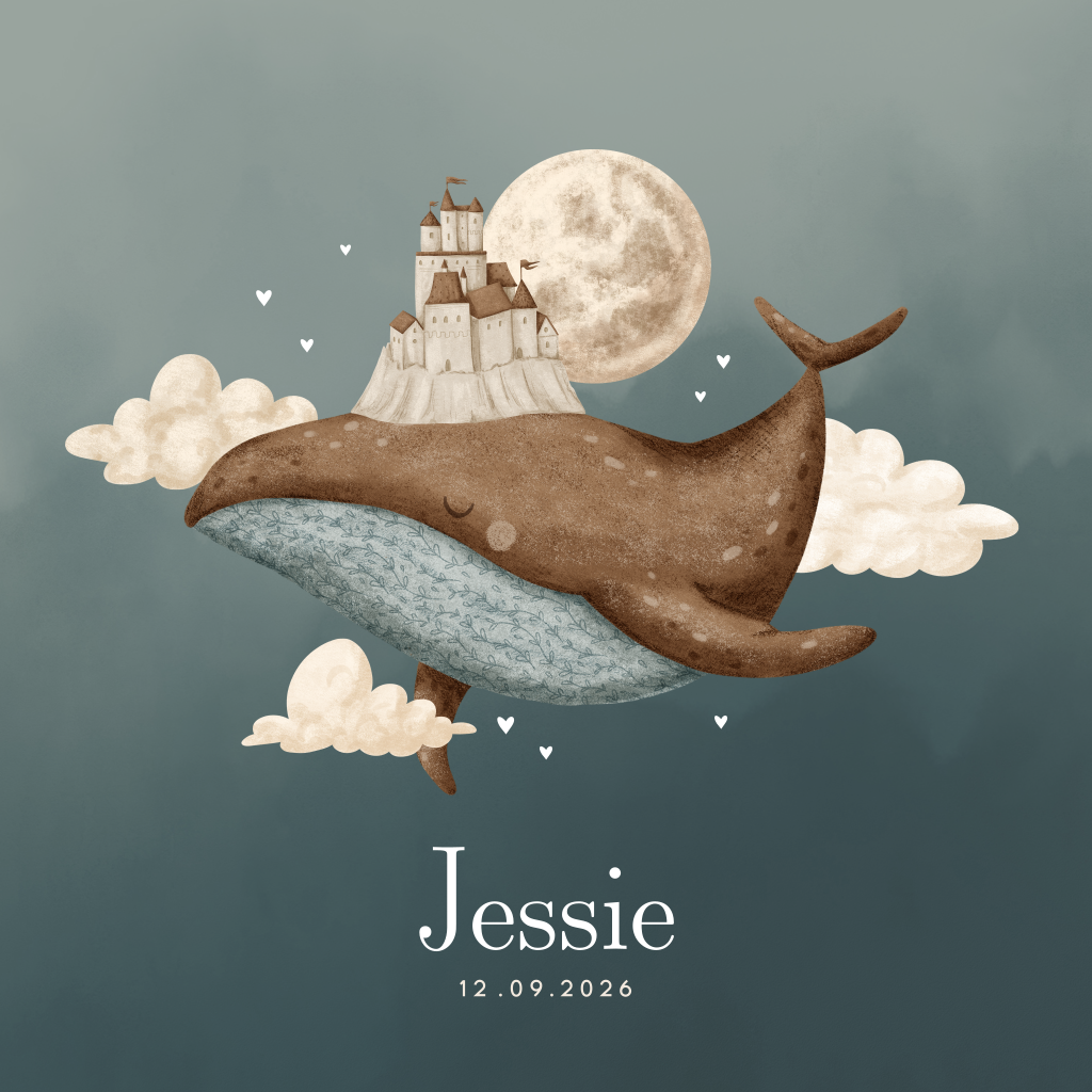 Geboortekaartje met folie en vliegende walvis met luchtkasteel
