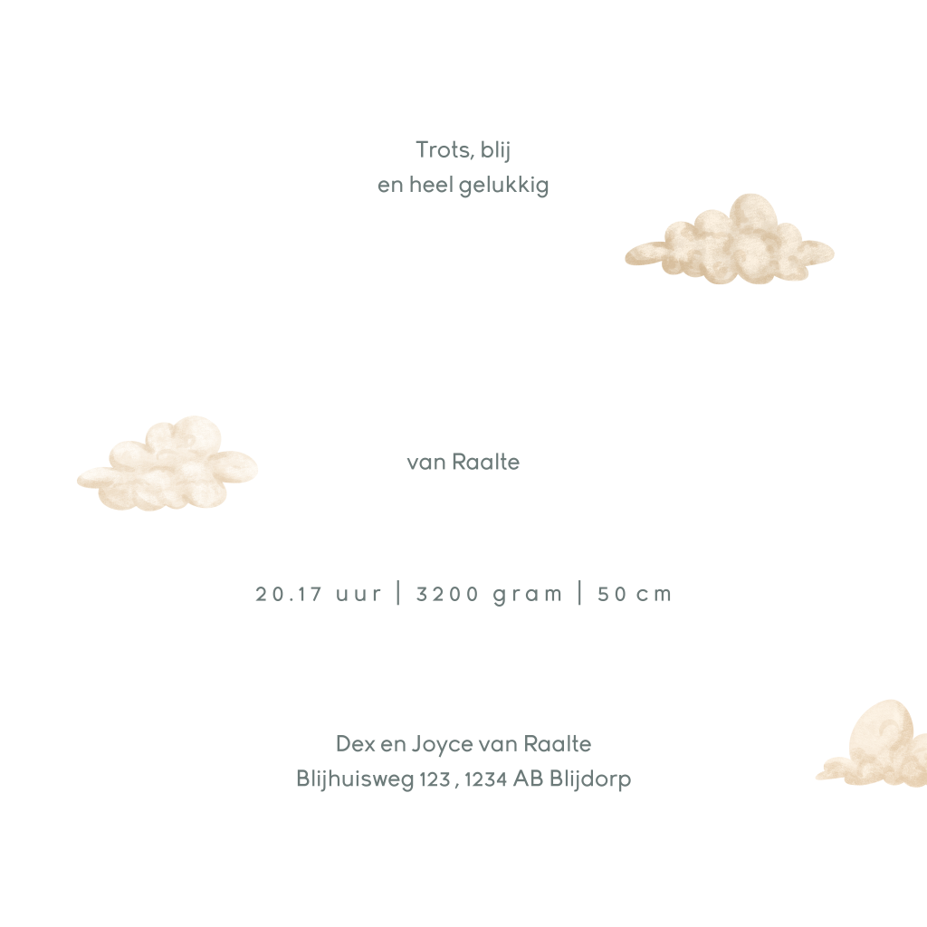 Bij de geboorte van jullie kleine jongen, hoort een speciaal geboortekaartje. Dit illustratie geboortekaartje Jessie heeft bijna een magische en sprookjesachtige uitstraling, een zwevende walvis in de wolken met een zandkasteel. Om het compleet te maken zie je op de achtergrond een maan en hartjes in écht roséfolie. Pas de kleuren, teksten en kleur van de folie gemakkelijk aan in de editor. Hulp nodig? Wij helpen je graag.
