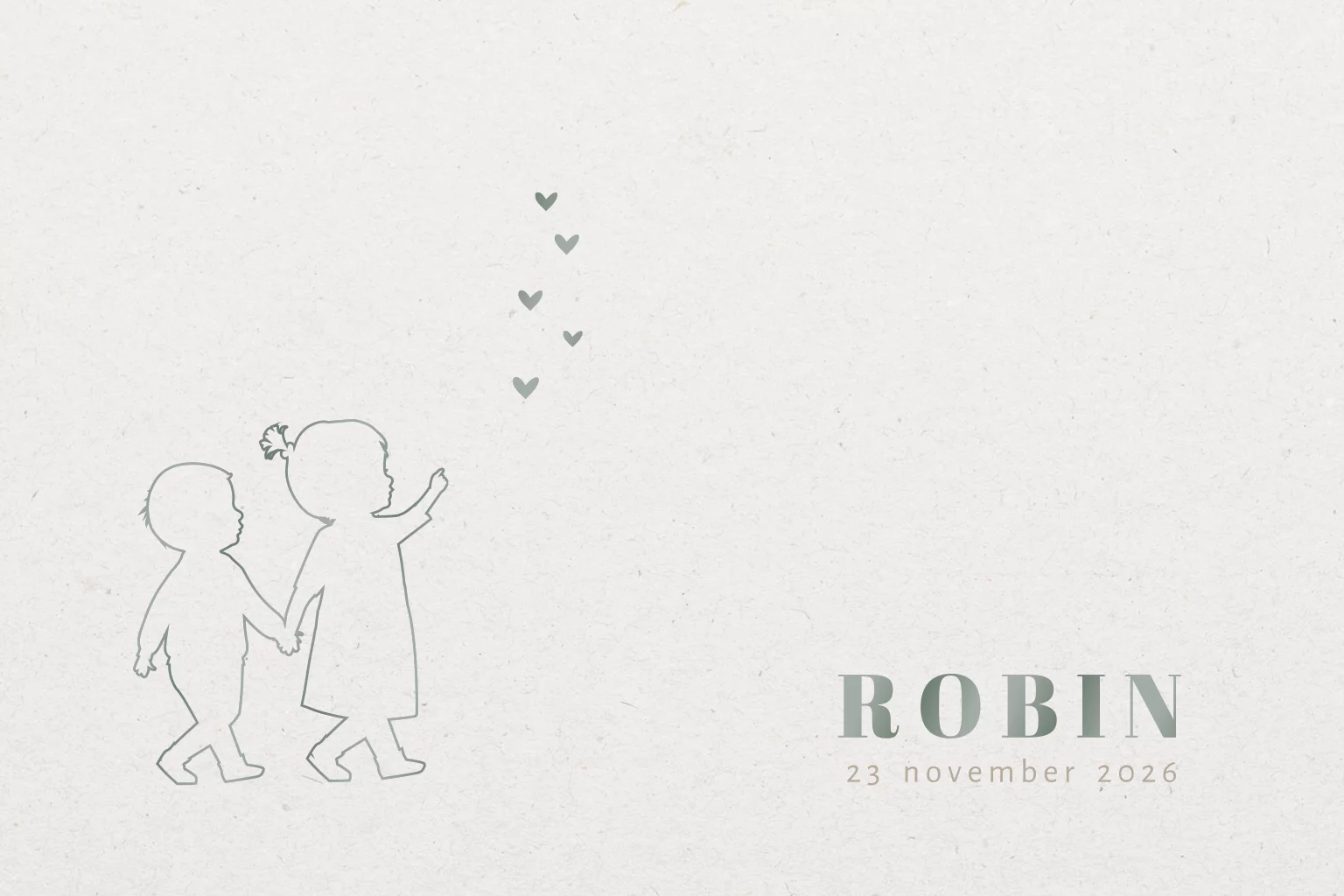 Schitterend geboortekaartje met hoogglans, wat de kaart een luxe uitstraling geeft. Dit babykaartje Robin, met ronde hoeken, is geschikt voor zowel een meisje als een jongen. Op deze kaart een oneline silhouet van een grote zus met haar broertje, wijzend naar lieve hartjes. De achtergrond heeft een lichte kartonlook. Afbeeldingen, teksten en (hoogglans)kleuren pas je eenvoudig aan in onze ontwerpmodule.