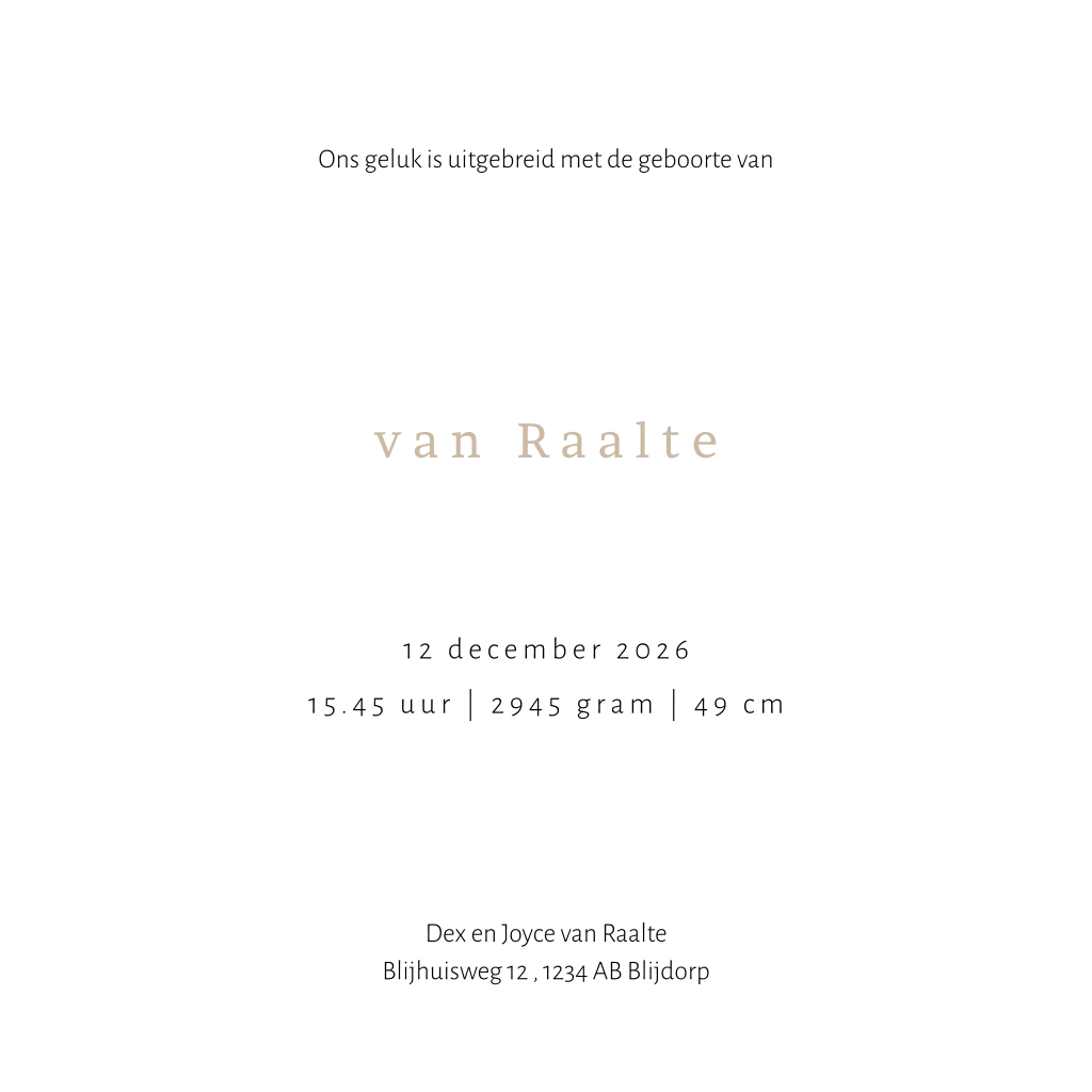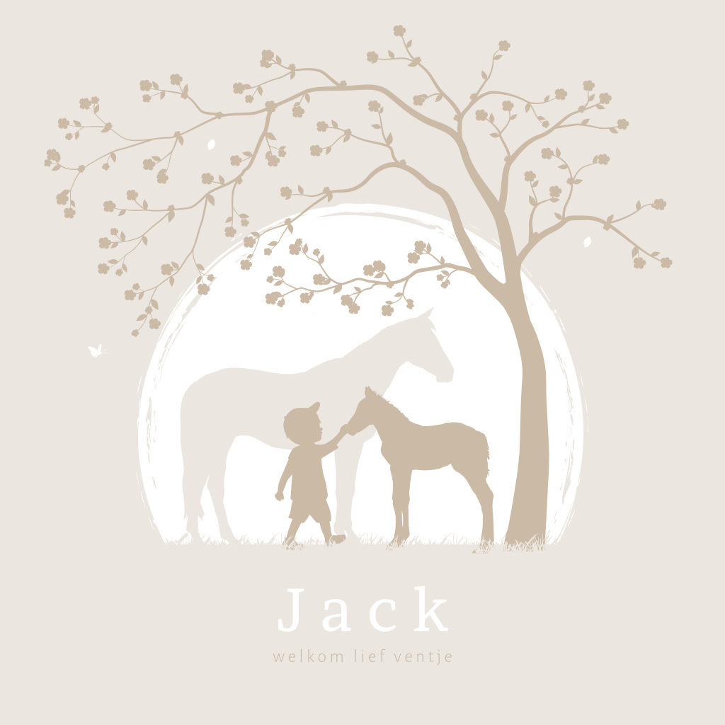 Hip geboortekaartje voor een eerste kindje, een zoon. Op dit babykaartje Jack een herfst tafereeltje met een paard en jongen onder een boom die een veulen aait. De nude kleuren zijn helemaal in de trend van nu. Wat dit babykaartje extra bijzonder maakt, is dat de gouden elementen op de voor- en achterzijde worden gedrukt in écht goudfolie. Zoals de naam van jullie zoon en enkele vallende blaadjes. Pas het kaartje naar je eigen smaak aan in de editor. Ook mogelijk voor een andere gezinssamenstelling of met andere foliedruk zoals koperfolie, roséfolie of zilverfolie.