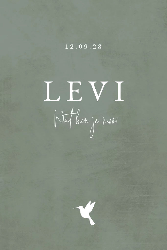 Stoer maar exclusief geboortekaartje voor een jongen. De gouden elementen, waaronder de babynaam Levi, worden gedrukt met echt goudfolie. Dat geeft de kaart een luxe uitstraling. De ruwe achtergrond in de kleur legergroen maakt dit kaartje stoer. Ook mogelijk met koperfolie, zilverfolie of roséfolie. Dit is aan te passen in de editor.